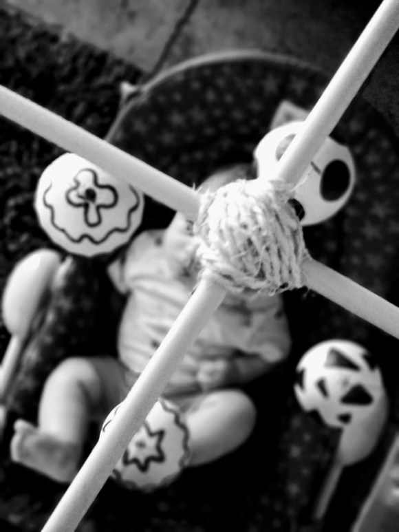 Una vegada pintades les boles i penjades dels pals de fusta, hem fet aguantar el mòbil en un raconet del menjador. L’Arcadi, des de la seva cadireta (que últimament ja ha passat a ser multifuncional! :D) el pot anar contemplant a ratets! També podeu traslladar el mòbil en diferents llocs, per exemple, al bressol o al llitet. Quan estigueu cansats de veure aquestes boles, sempre les podeu renovar en un obrir i tancar d’ulls! Tot depèn de la vostra inspiració…!