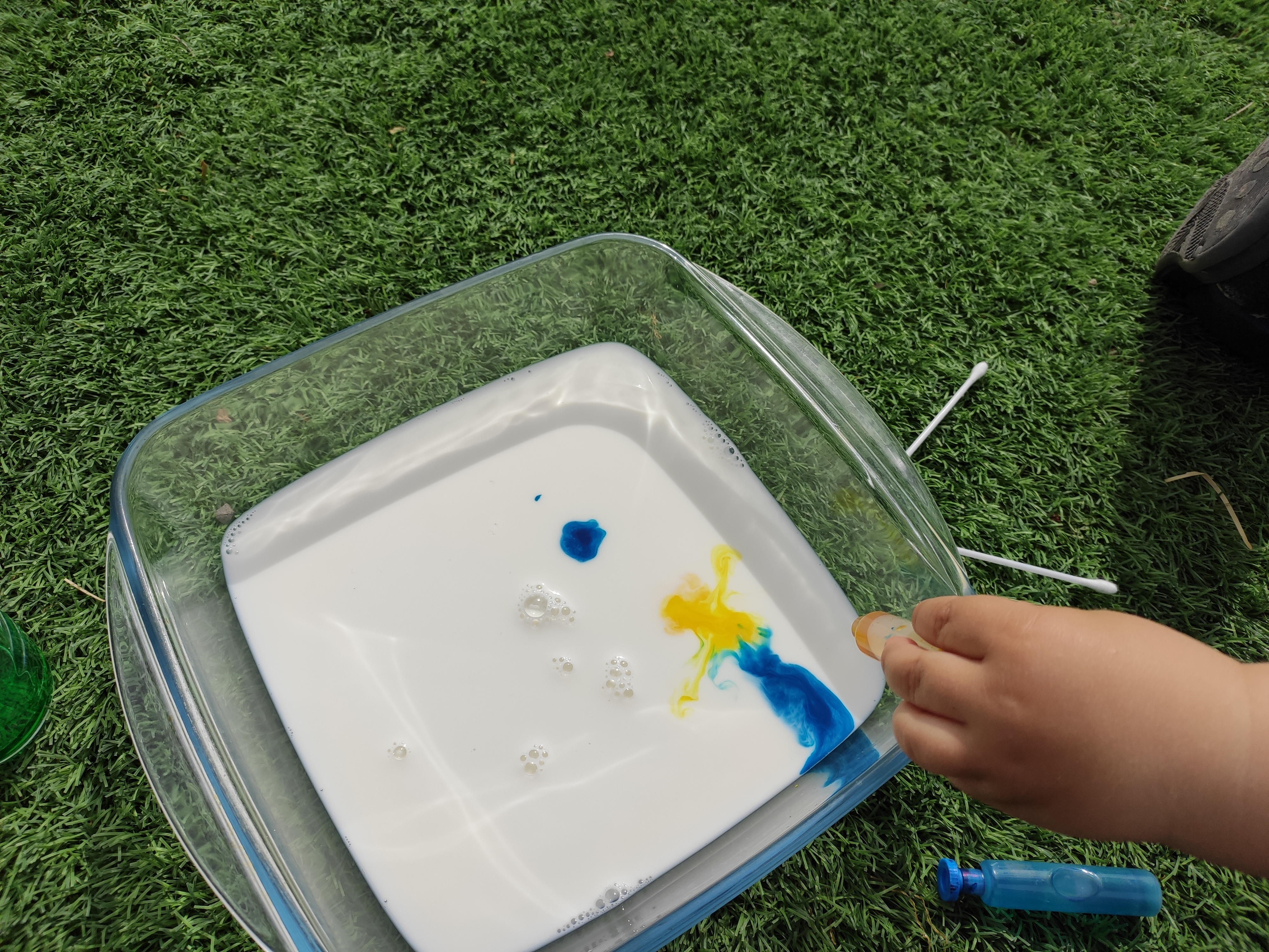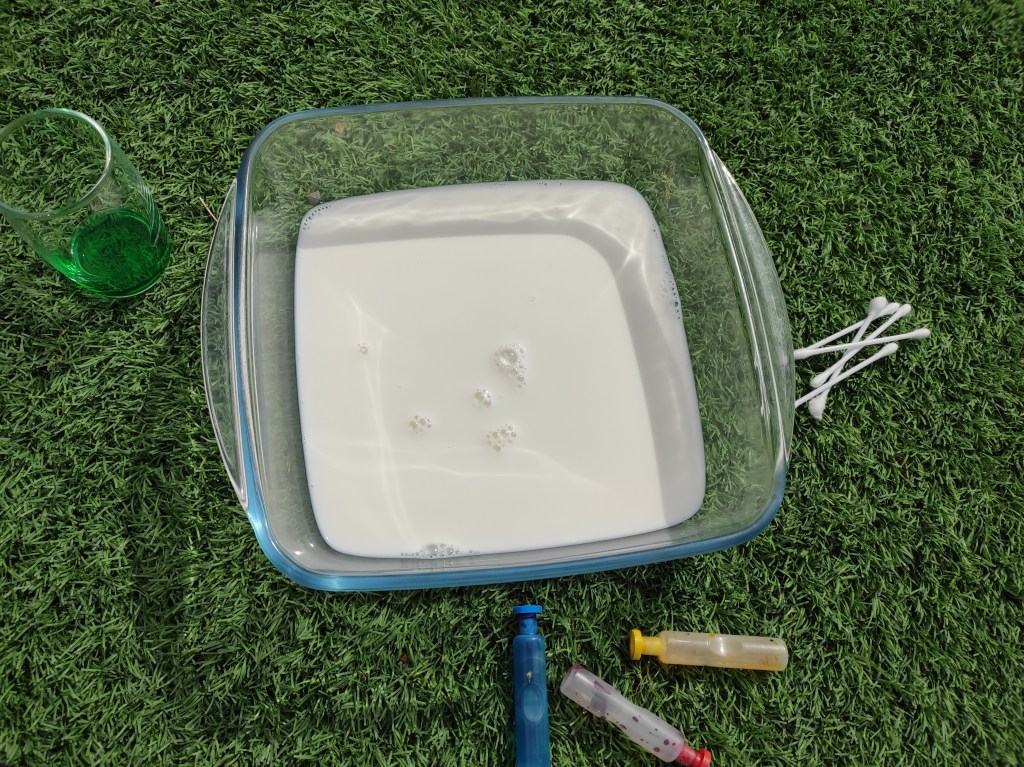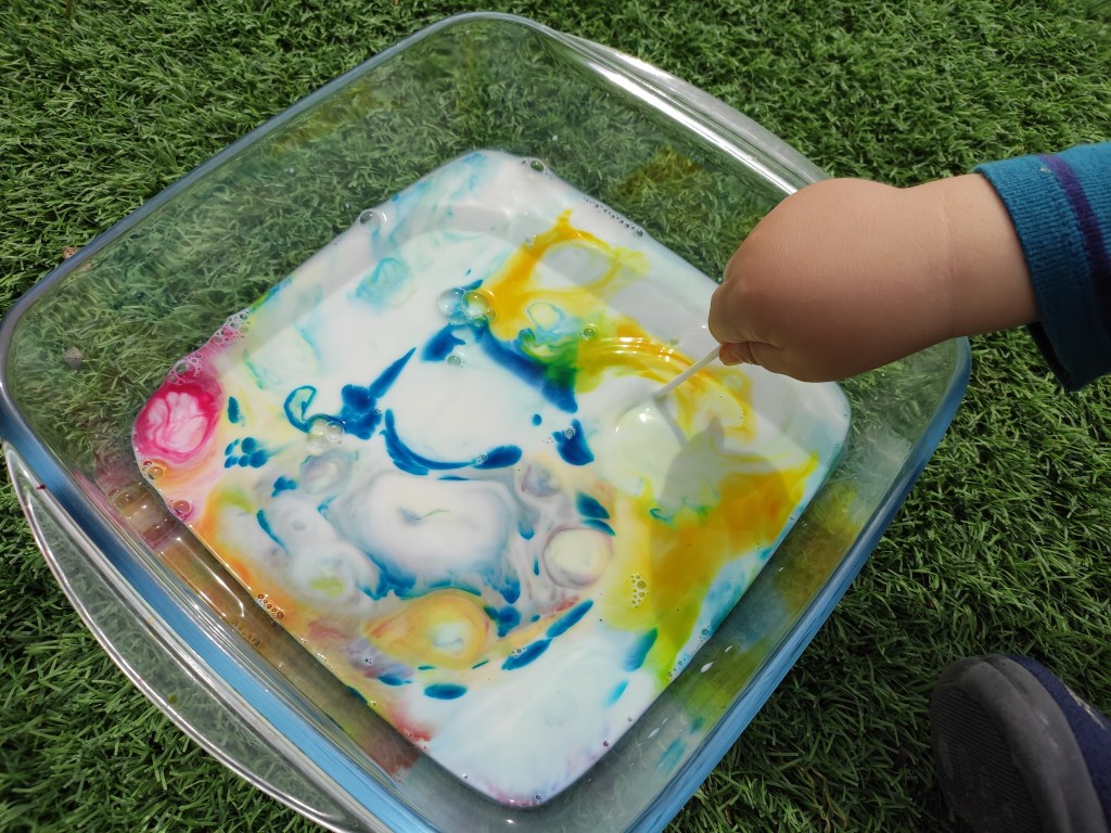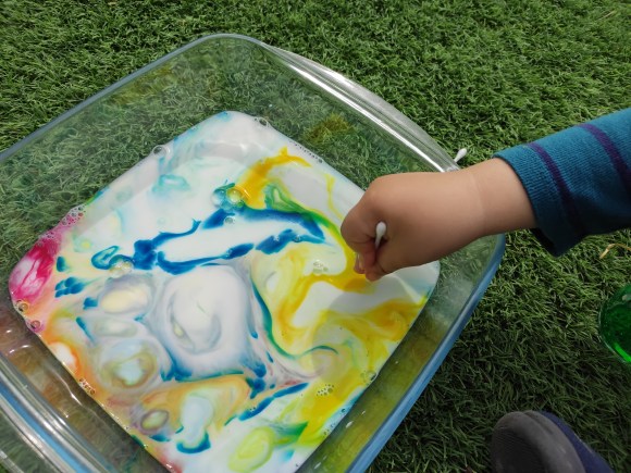 Avui, per exemple, amb l’Arcadi hem treballat la proposta de les nostres mestres de la llar @vedrunatarrega. Es tractava de realitzar l’experiment de tenyir llet amb colorant, una tasca senzilla i molt atractiva. És ideal per tractar apsectes científics amb els alumnes més grans i gaudir de l’espectacle de colors que es crea amb els més petits.