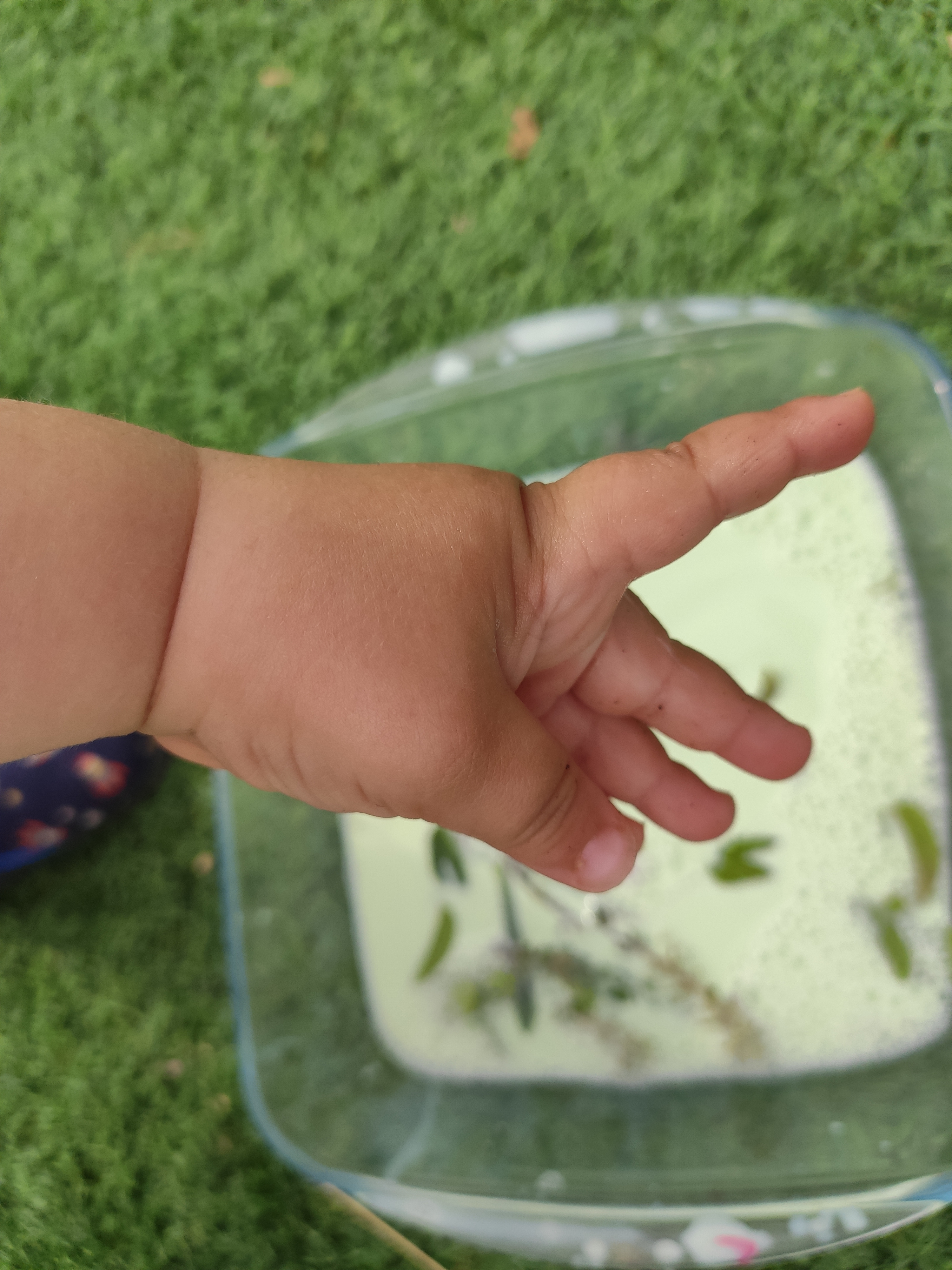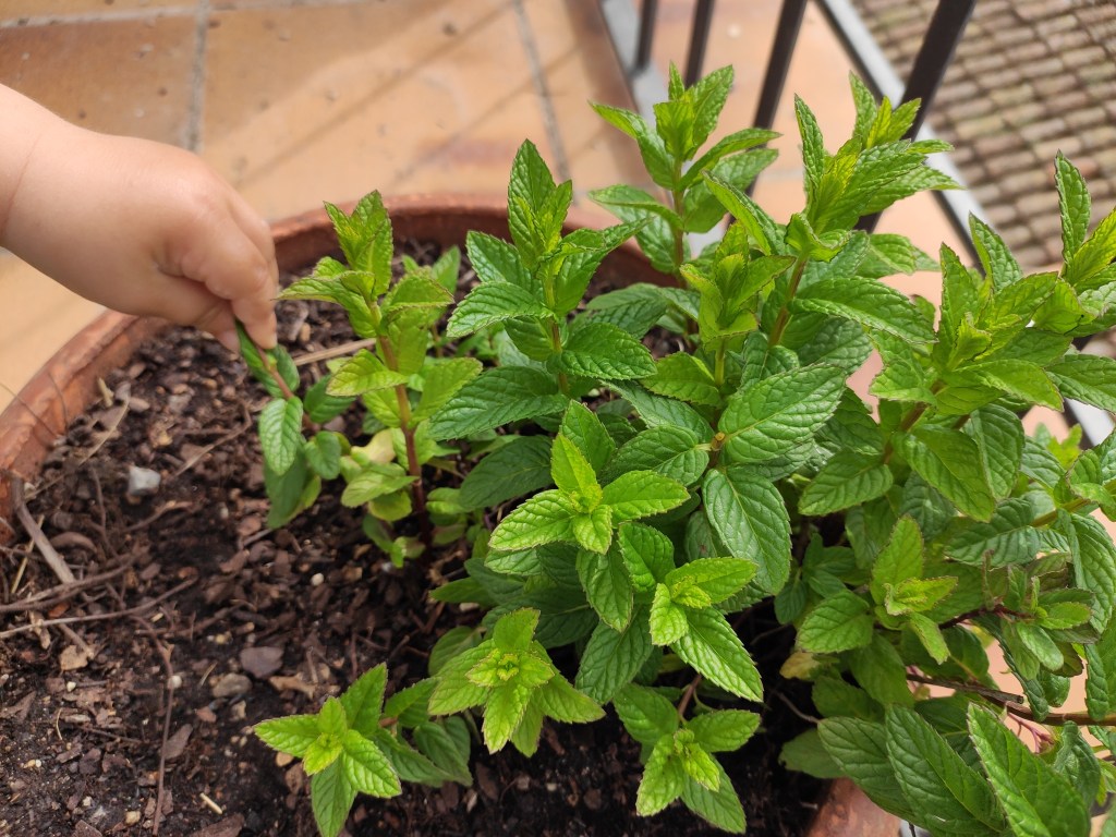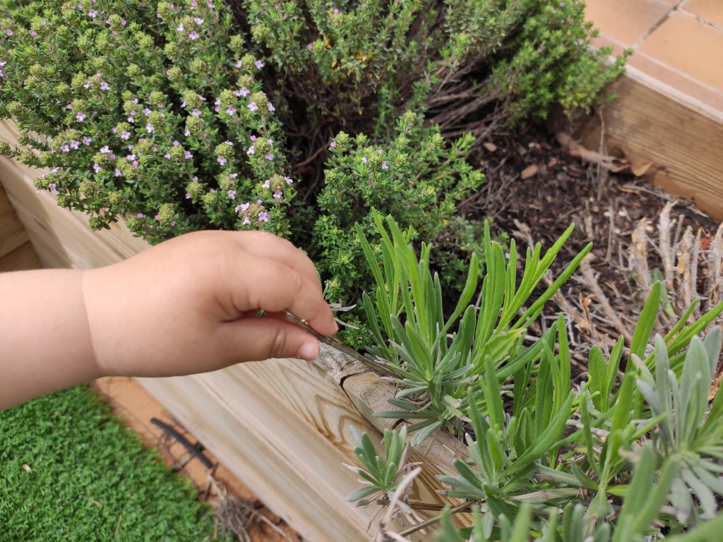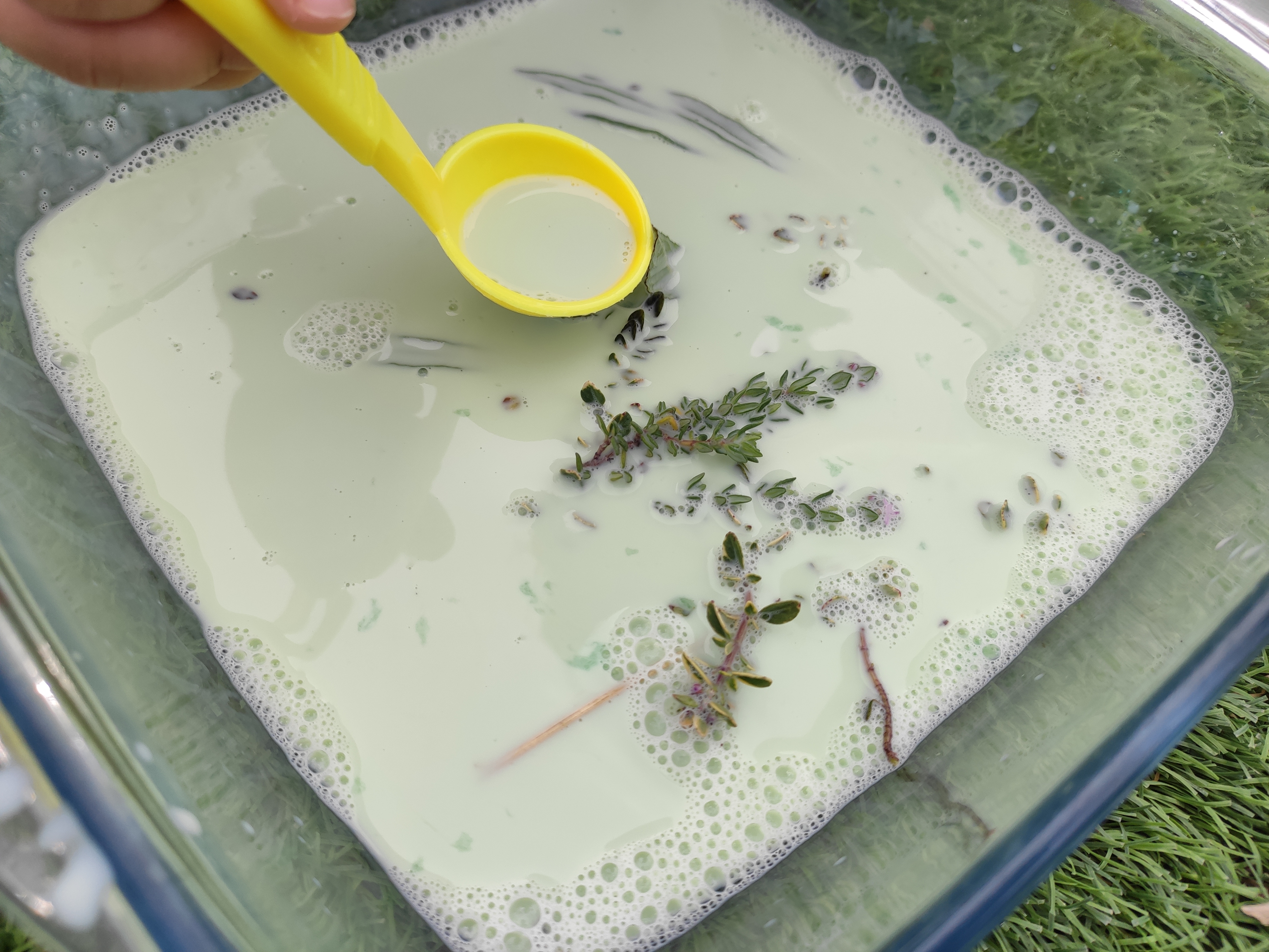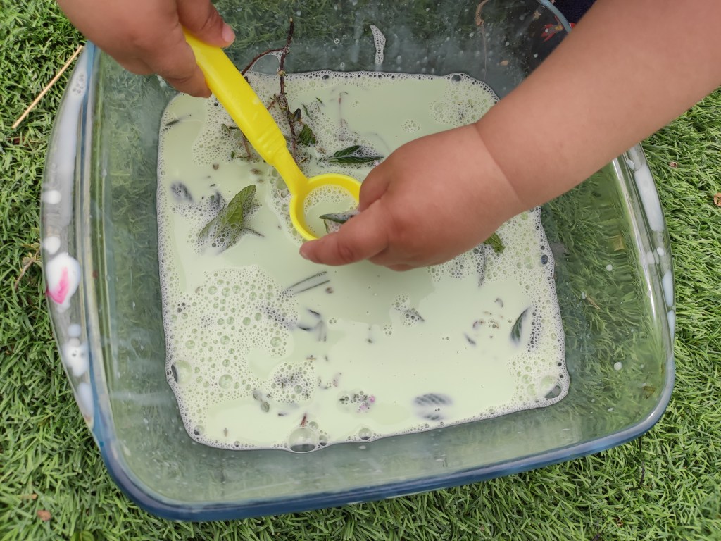 Una vegada hem posat en pràctica l’activitat, i la llet ha acabat absorbint tots els colors, l’Arcadi ha seguit remenant-la i posant el potet del sabó que havíem utilitzat a dins, tot fent transvassaments i dient:- Fem sopa mama! Ha passat una bona estona així fins que li he portat un parell de tassetes i el nostre “minicullerot” i ha dit: -Posem floretes dins! Així que hem començat a fer una sopa aromàtica amb totes les plantes de la terrassa: menta, lavanda, timó i herbetes vàries!