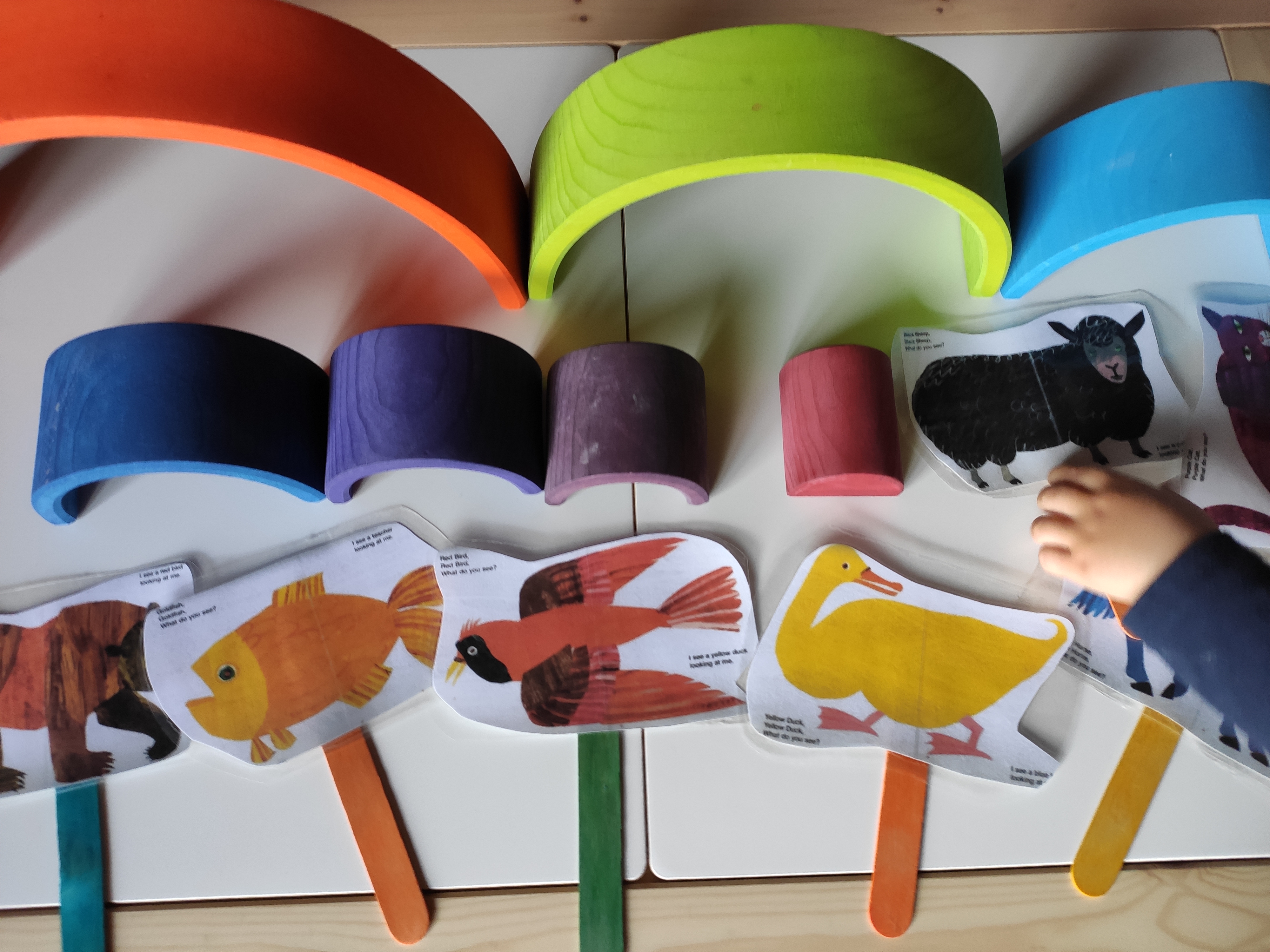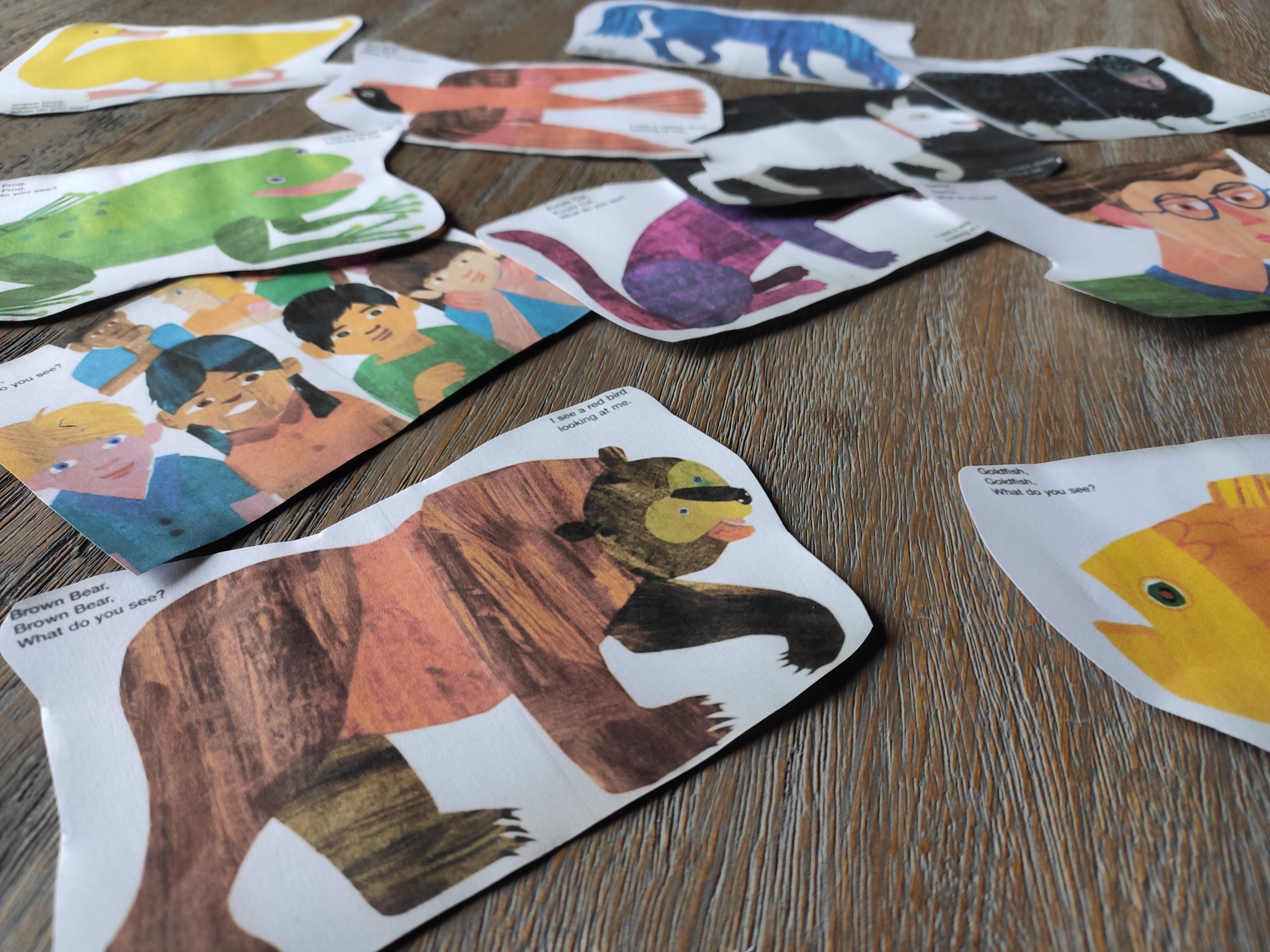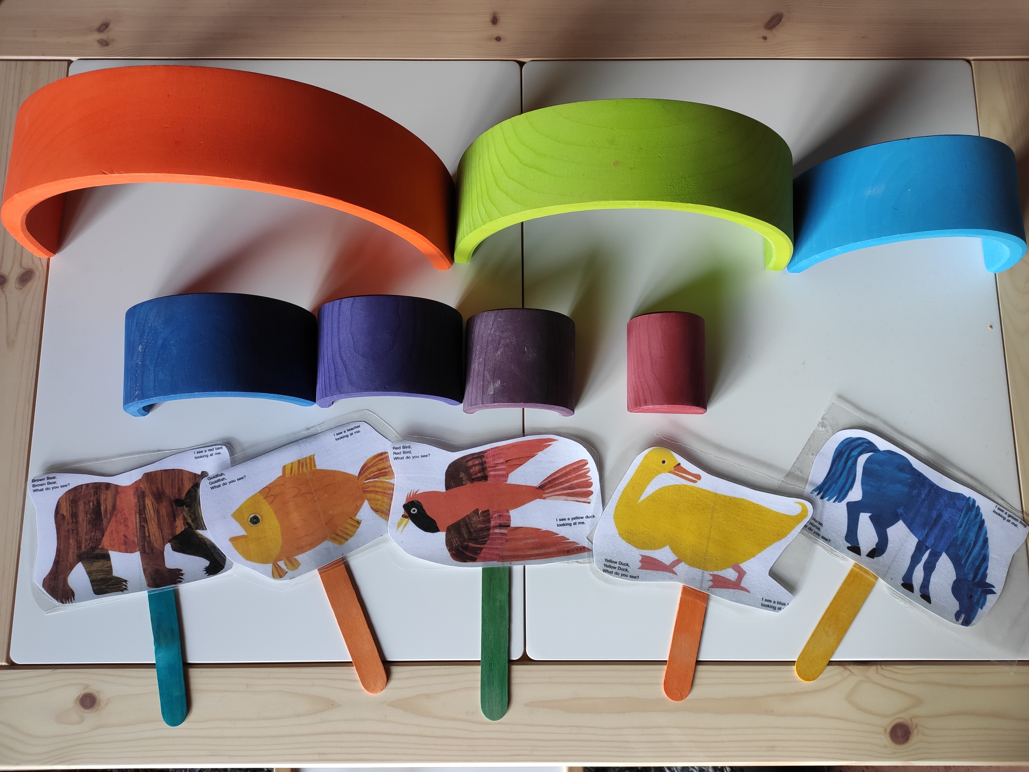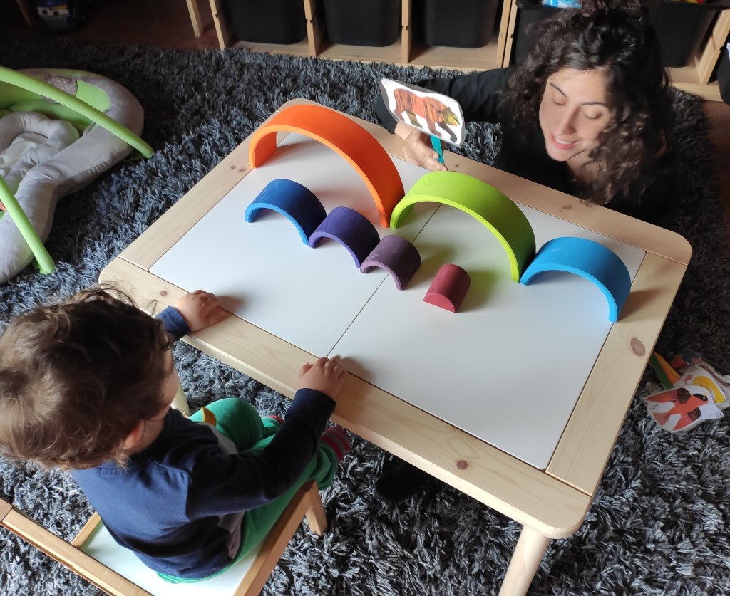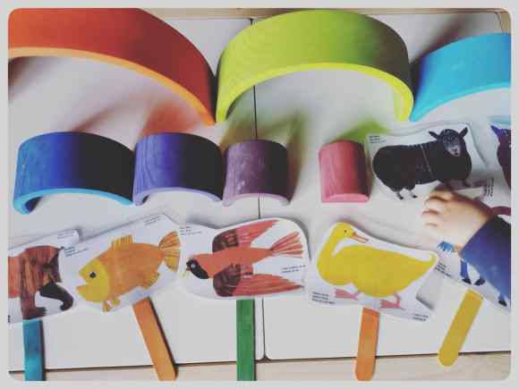 Avui les nostres mestres de la llar @vedrunatarrega ens han recomanat el conte en anglès “Brown Bear, Brown bear, what do you see?”. Aquest conte és ideal per començar a treballar els animals i els colors amb els més petits! Aprofitant aquest recurs, amb l’Arcadi hem pensat fer unes titelles amb les imatges per tal de poder explicar el conte i treballar el vocabulari de forma més manipulativa. Així que hem imprès les imatges de la història en digital, les hem plastificat i les hem fet aguantar amb palets de fusta. Una vegada hem tingut el material preparat, hem explicat el conte i hem fet un parell de jocs per treballar algunes de les paraules. Tot plegat ha quedat força casolà però funcional. Us deixem aquí algunes imatges!