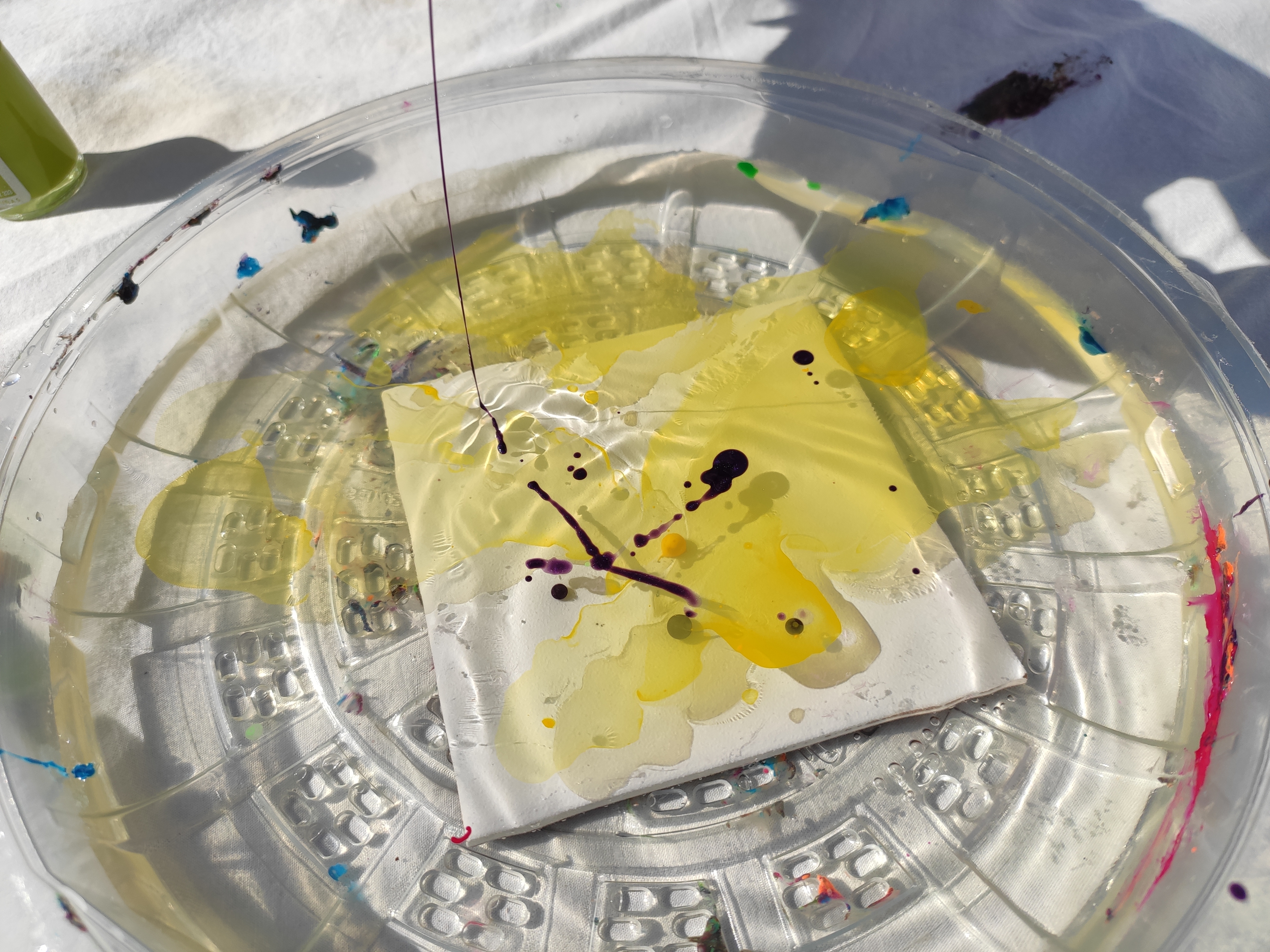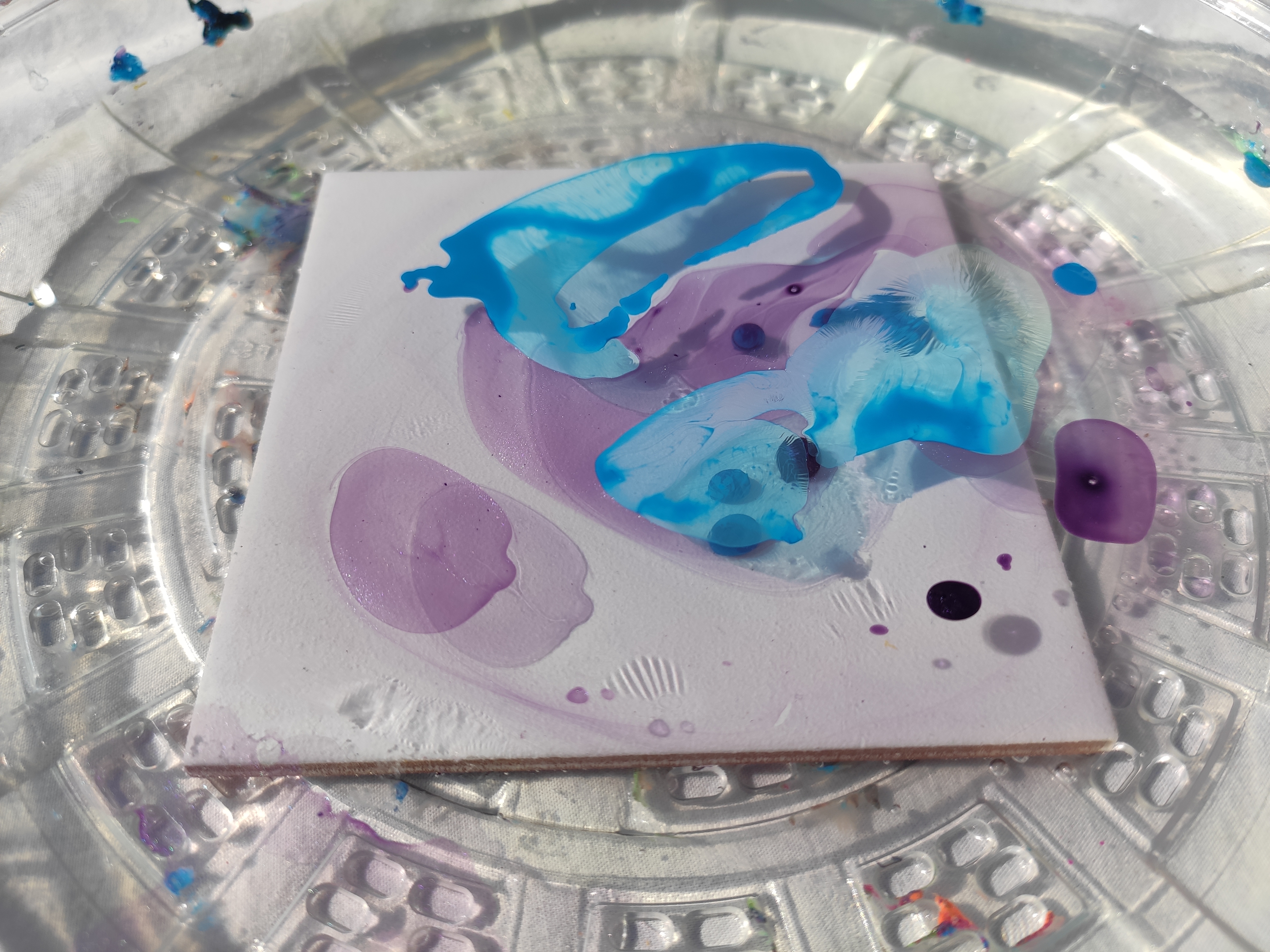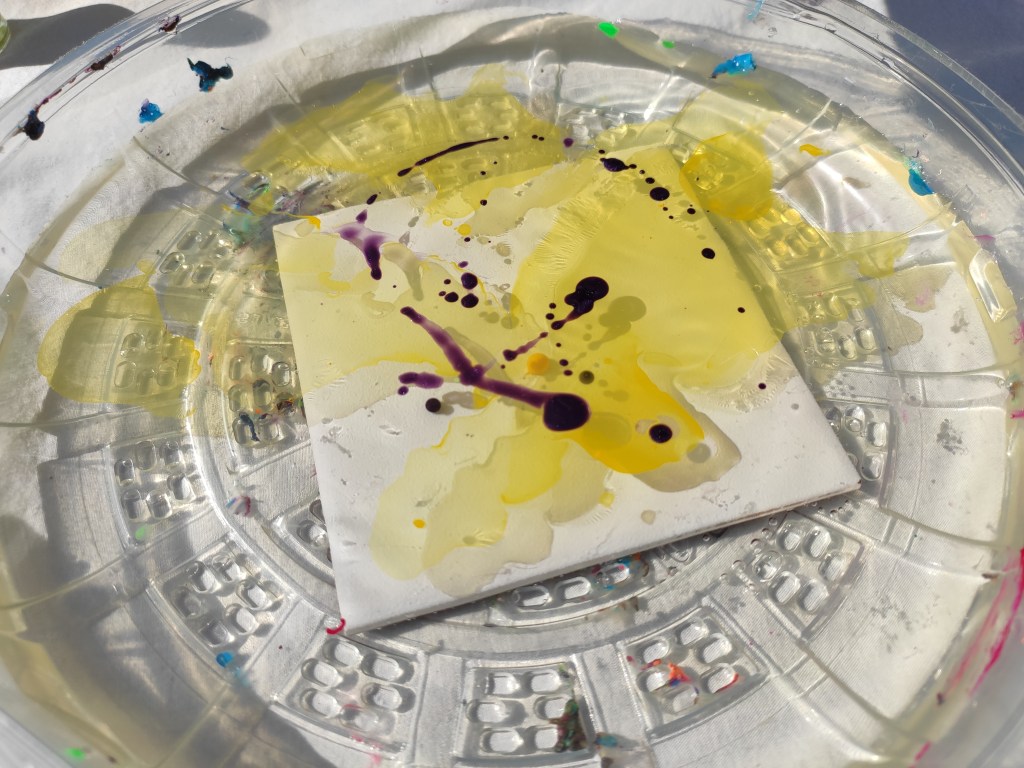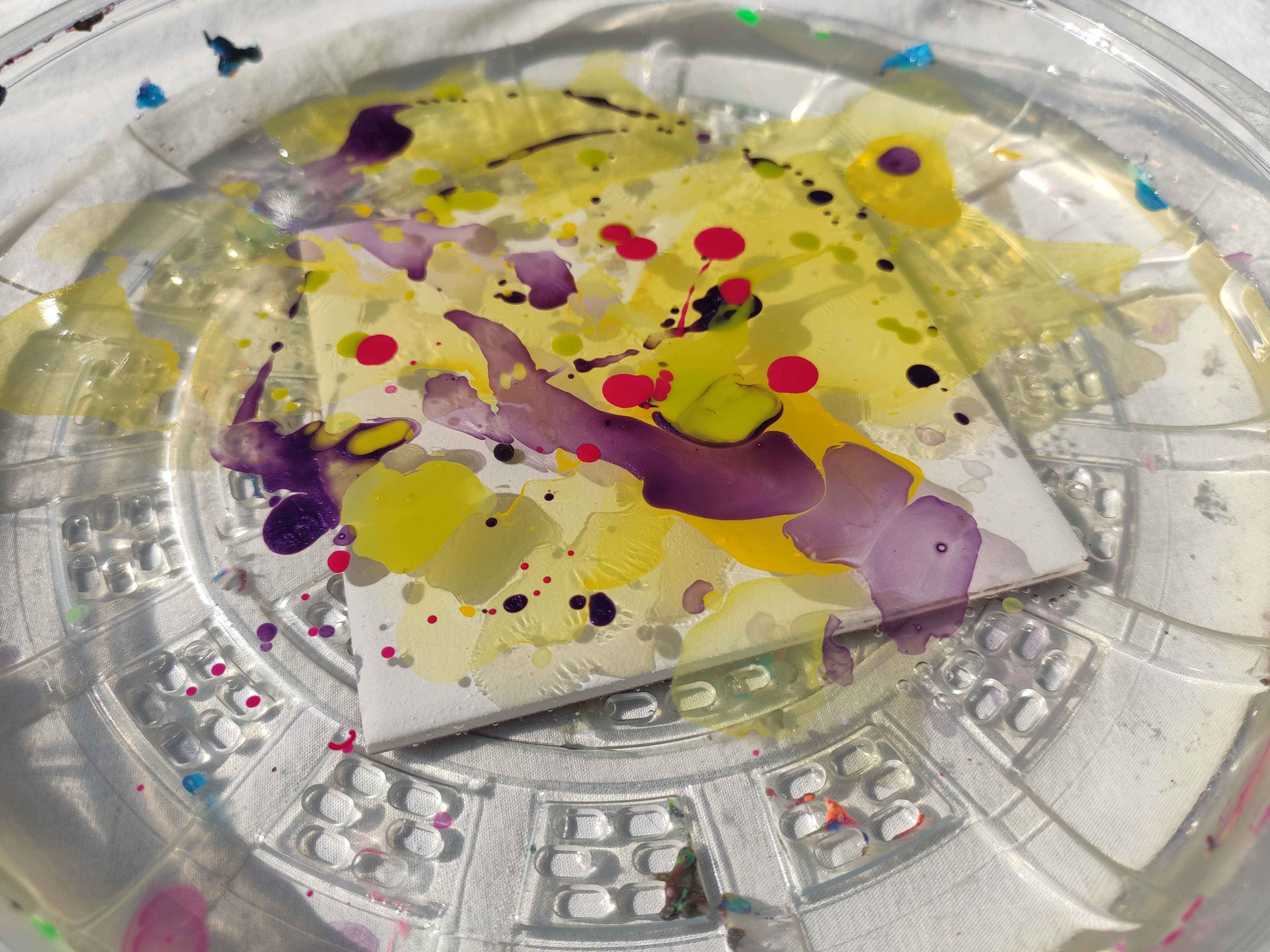 Hem de dir-vos que no ha acabat de quedar com realment volíem, però el resultat és força xulo! Per fer-ho simplement hem posat un recipient amb aigua, hi hem submergit la rajola i hem tirat tres o quatre colors de pintaungles. Després, a poc a poc, hem tret les rajoles de l’aigua i les hem deixat al sol per assecar-se.
