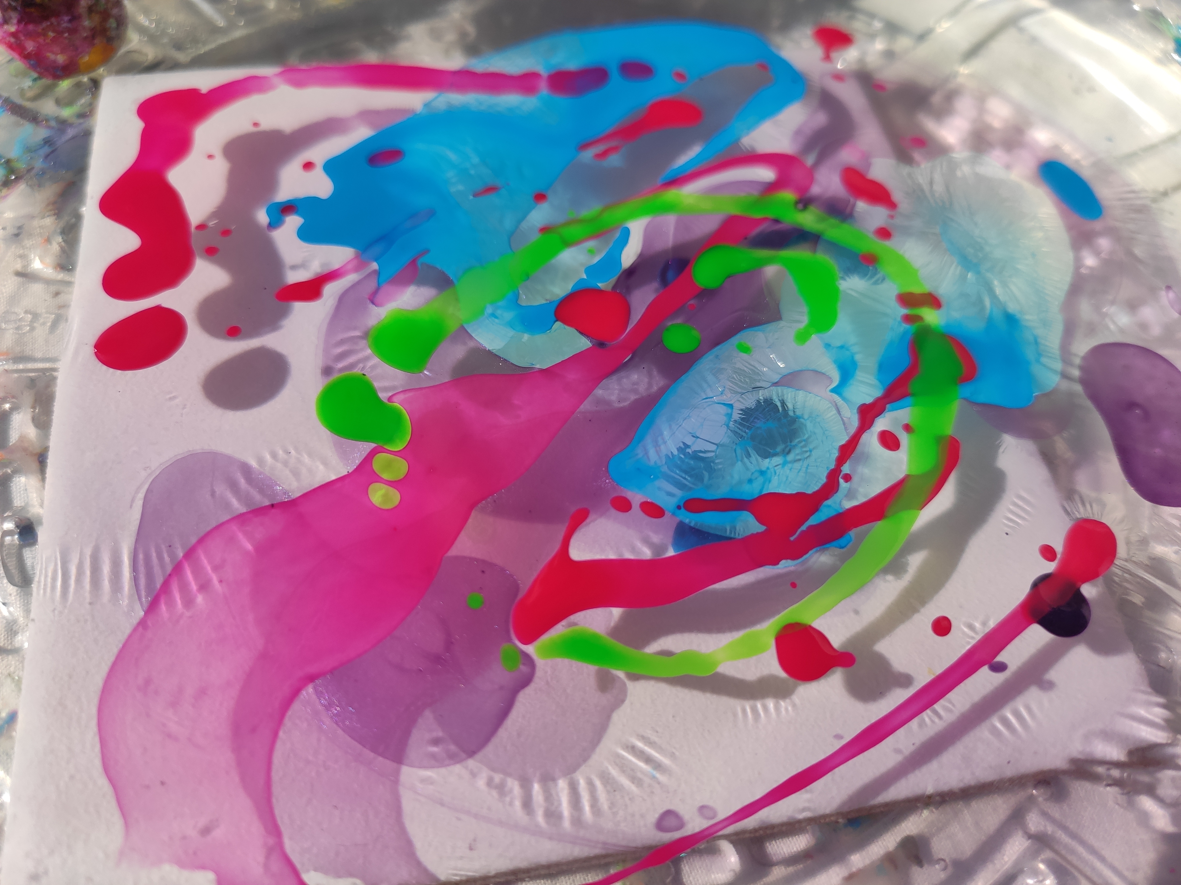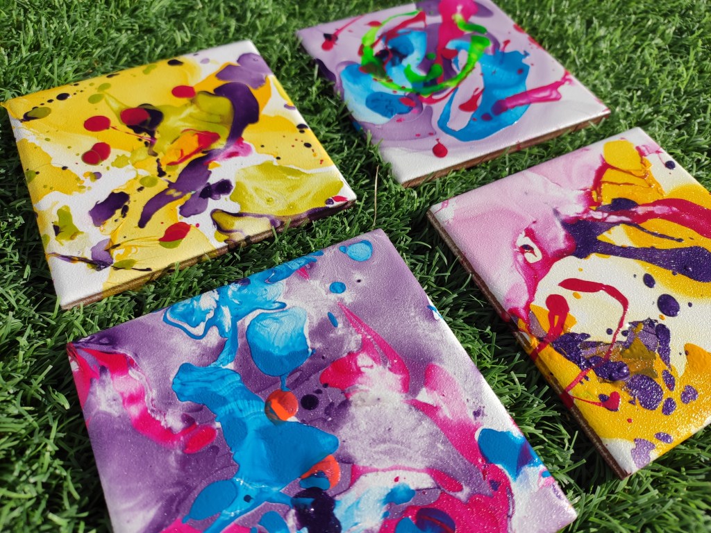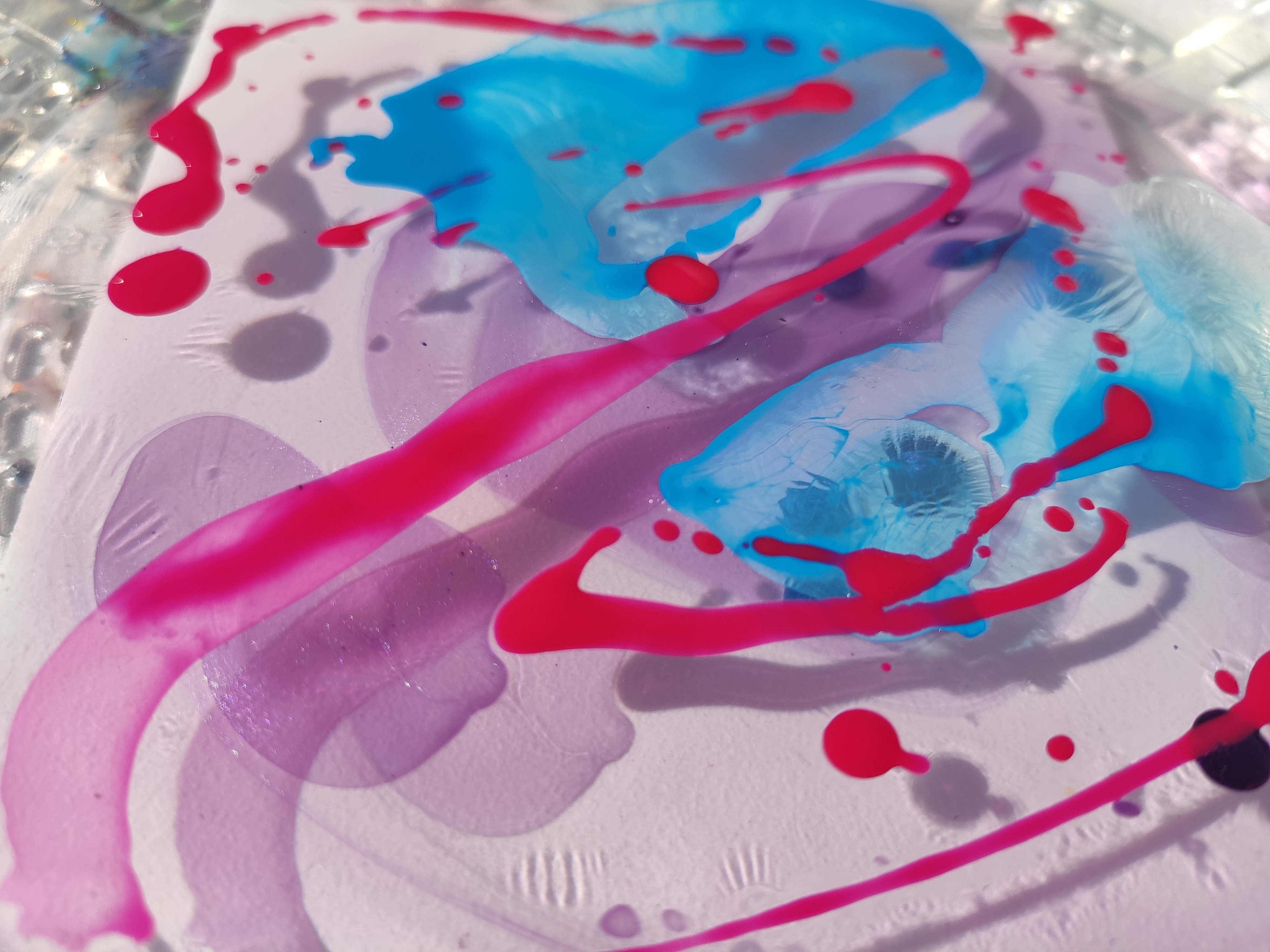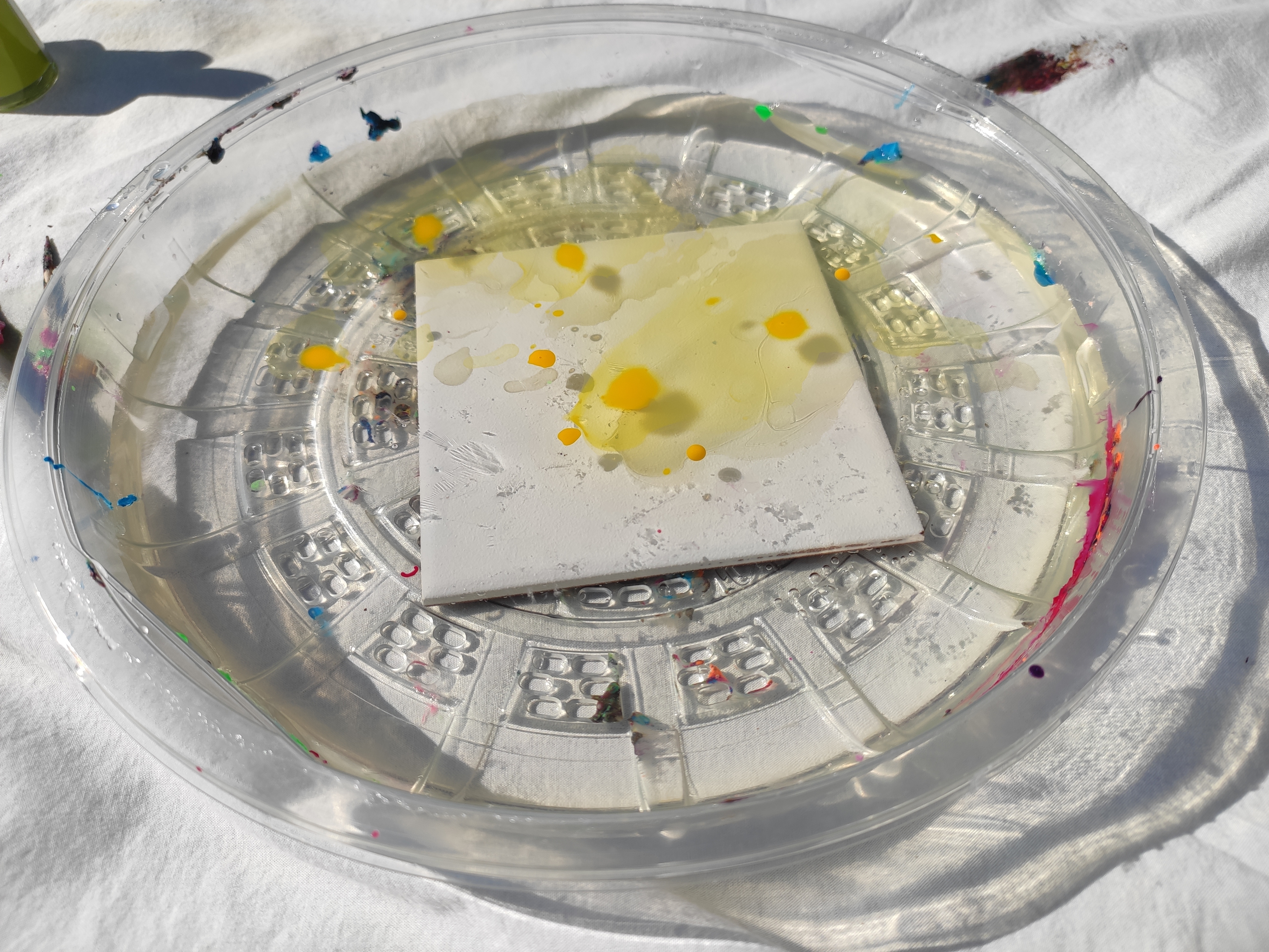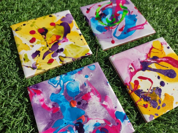 Hem de dir-vos que no ha acabat de quedar com realment volíem, però el resultat és força xulo! Per fer-ho simplement hem posat un recipient amb aigua, hi hem submergit la rajola i hem tirat tres o quatre colors de pintaungles. Després, a poc a poc, hem tret les rajoles de l’aigua i les hem deixat al sol per assecar-se.