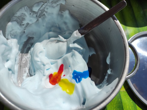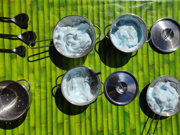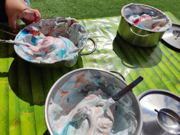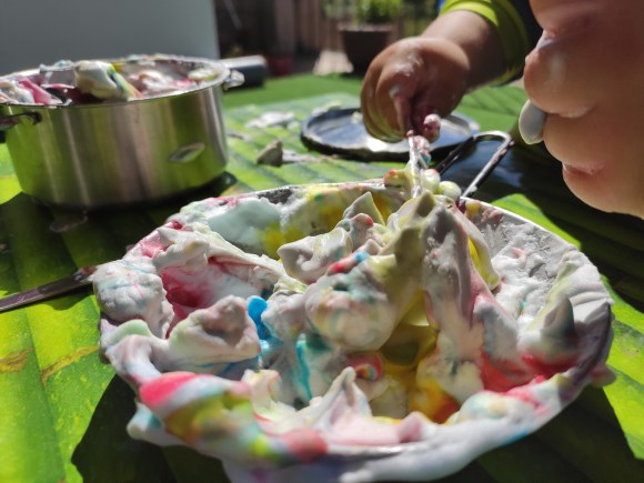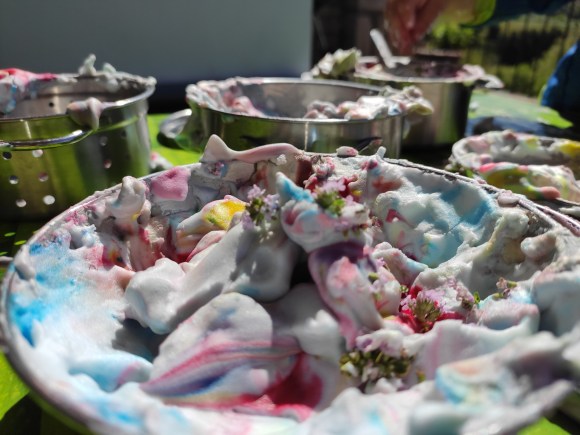 Aquests dies de confinament l’única cuina que l’Arcadi veu és la del seu pare i la d’en Nandu Jubany a través dels seus famosos vídeos d’Instagram. No em direu que no són bons referents…? 😀 I no em direu que molts de vosaltres no us heu fet fans del Jubany durant aquest confinament i el seguiu mentre us cauen els ulls durant la migdiada, quan allargueu l’estada al vàter, mentre doneu popa als vostres petits, o en altres ocasions fantàstiques que ens brinden aquests dies que estem vivint.En la nostra quotidianitat anterior a la clausura, l’Arcadi també veia cuinar molt a les seves àvies, es posava una cadira al costat del marbre i anava passejant les manetes per tots els ingredients. Esperem que amb aquesta pràctica, algun dia arribi a cuinar millor que la seva mare! :).Avui també hem cuinat, però ho hem fet amb espuma d’afaitar i colorant. Hem posat aquests ingredients dins de les petites cassoles i paelles de l’Arcadi, i hem començat a remenar! Primer de forma tímida, fent transvassaments amb les culleres i posant-hi, fins i tot, les herbetes de la terrassa. Poc després, però, l’Arcadi s’hi ha arremangat amb les mans, com els bons cuiners!- És finet, mama, finet!La sensació d’enfonsar tota la mà dins d’aquesta espuma plena de colors és realment agradable i permet un bon treball de l’estimulació tàctil i visual.Us deixem amb algunes imatges d’avui! Ha sigut difícil escollir-les ja que totes han captat un espectacle de colors fascinant!
