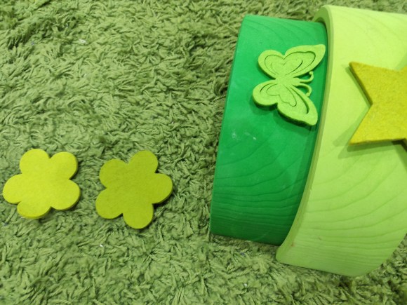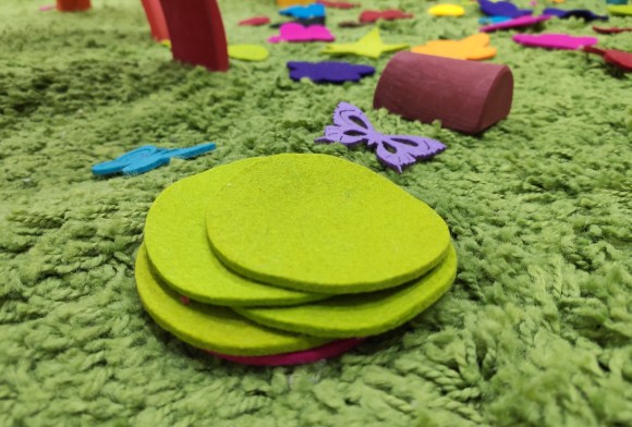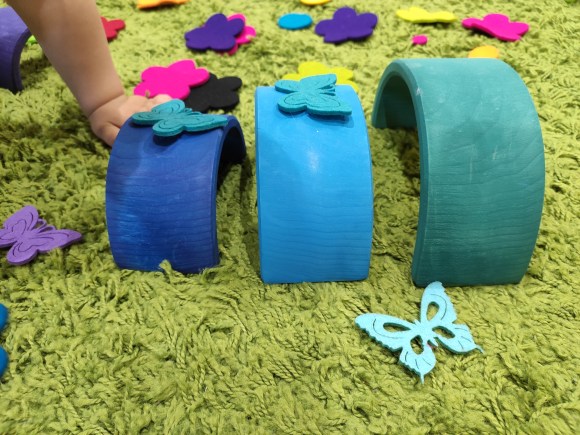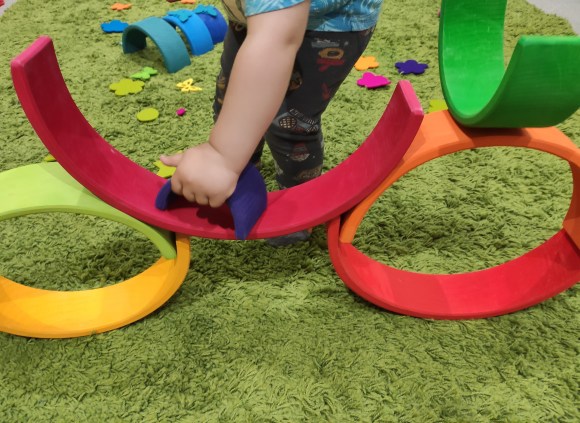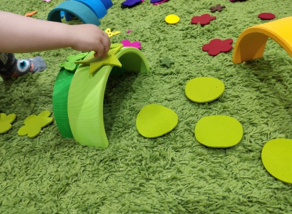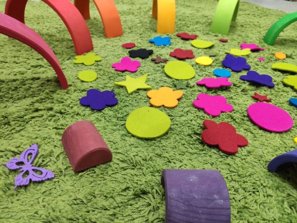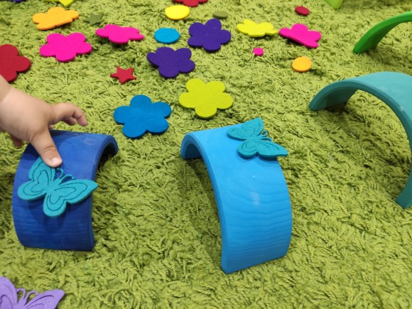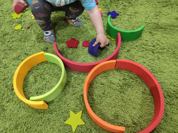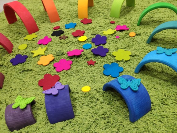 Les vides que pot arribar a prendre un objecte en les mans d’un infant són fascinants. Fa anys, cosia petits pins i collarets amb les figures de feltre que avui hem utilitzat. Jugava amb elles combinant formes i colors per crear noves narracions, com avui ha fet l’Arcadi. Feia temps que guardava en una caixeta aquest material, esperant poder donar-li un nou ús. Després de tant temps, l’he rescatat per crear una petita instal·lació de joc combinant-lo amb l’arc de sant martí Waldorf i aprofitant així les múltiples possiblitats de joc i de colors que aquest també ens dóna.