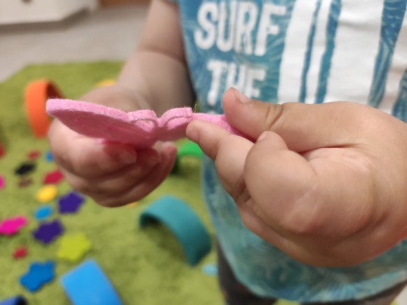 Per exemple, el primer que ha fet l’Arcadi quan ha entrat a l’espai ha sigut agrupar els cercles per una banda i les papallones per l’altra, reconeixent així la geometria de les formes. També anava dient altres formes que ell coneix: estrelles, cor, triangle, quadrat… Per altra banda, també hem classificat els materials per colors: blau, verd, taronja…