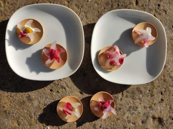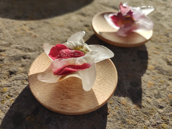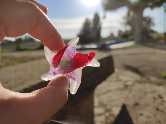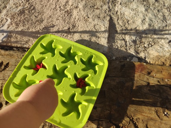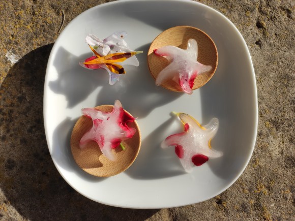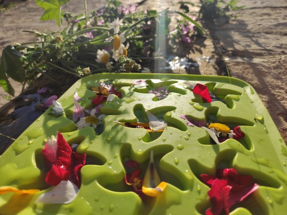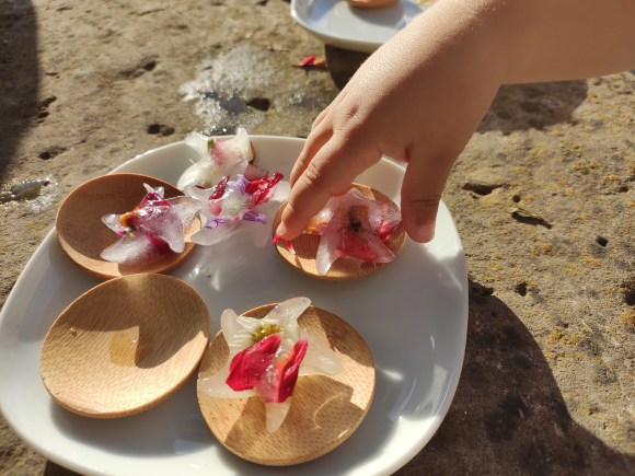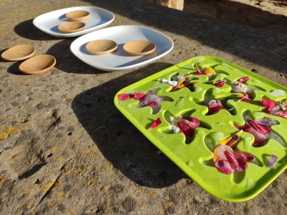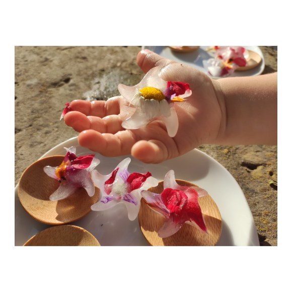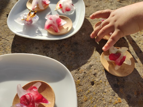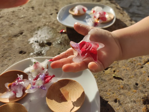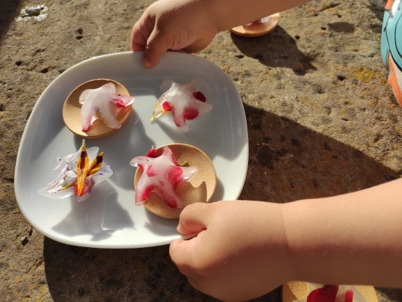 L’activitat d’avui és molt fàcil i molt probablement vosaltres ja l’heu fet casa. Es tracta de fer glaçons de flors. He de confessar-vos que, avui, m’ha agradat més fer l’activitat a mi que a l’Arcadi! En primer lloc, hem collit algunes flors del nostre entorn i n’hem recordat el nom (malves, ruelles, margarites…) i les hem posat en una glaçonera amb formes d’estrelles. En segon lloc, hi hem posat aigua, i, finalment, ho hem deixat unes hores al congelador. Després d’aquesta primera part, hem preparat uns platets per posar els glaçons i poder experimentar amb ells.