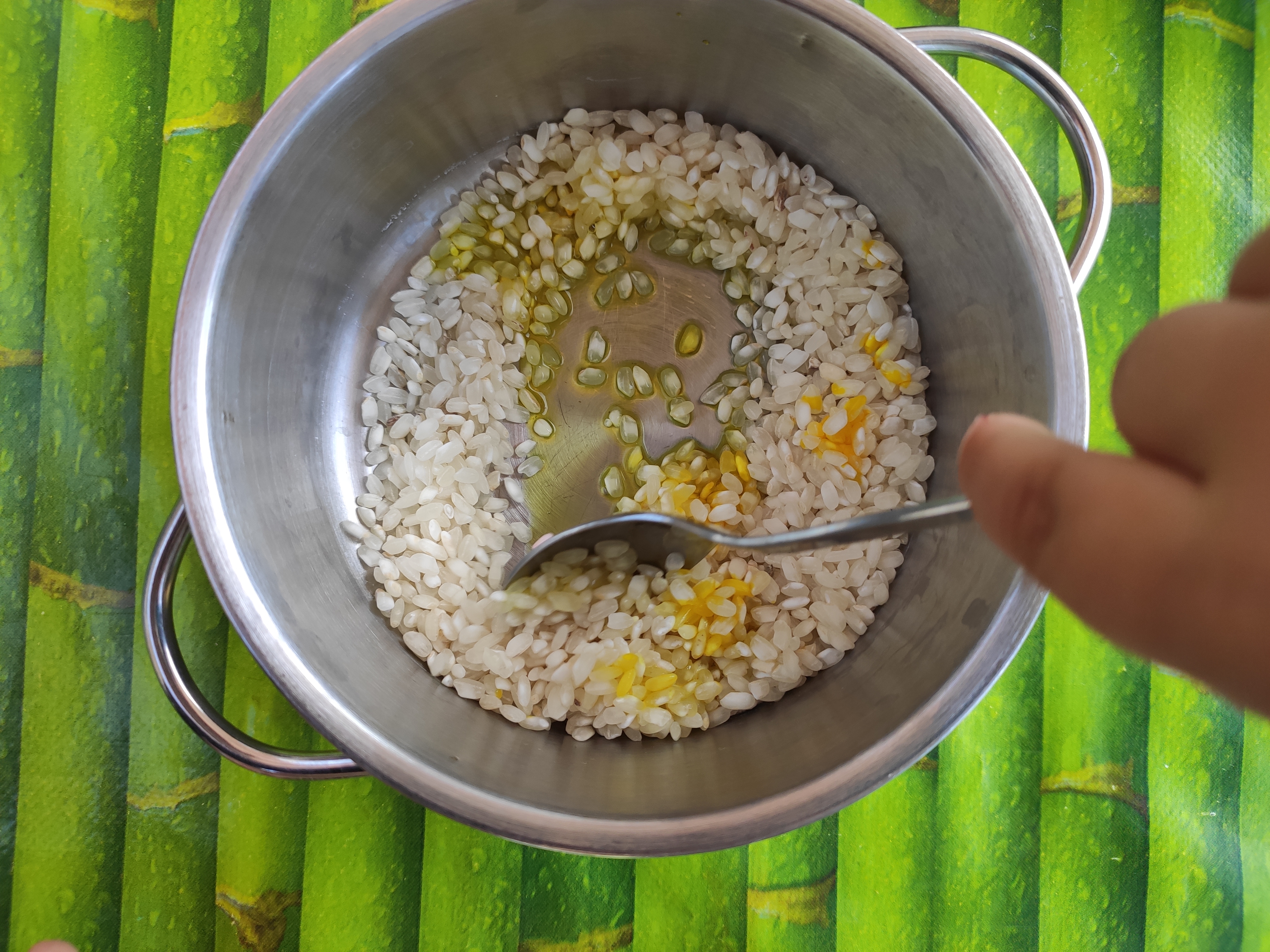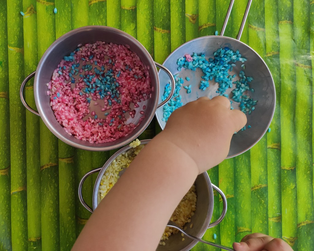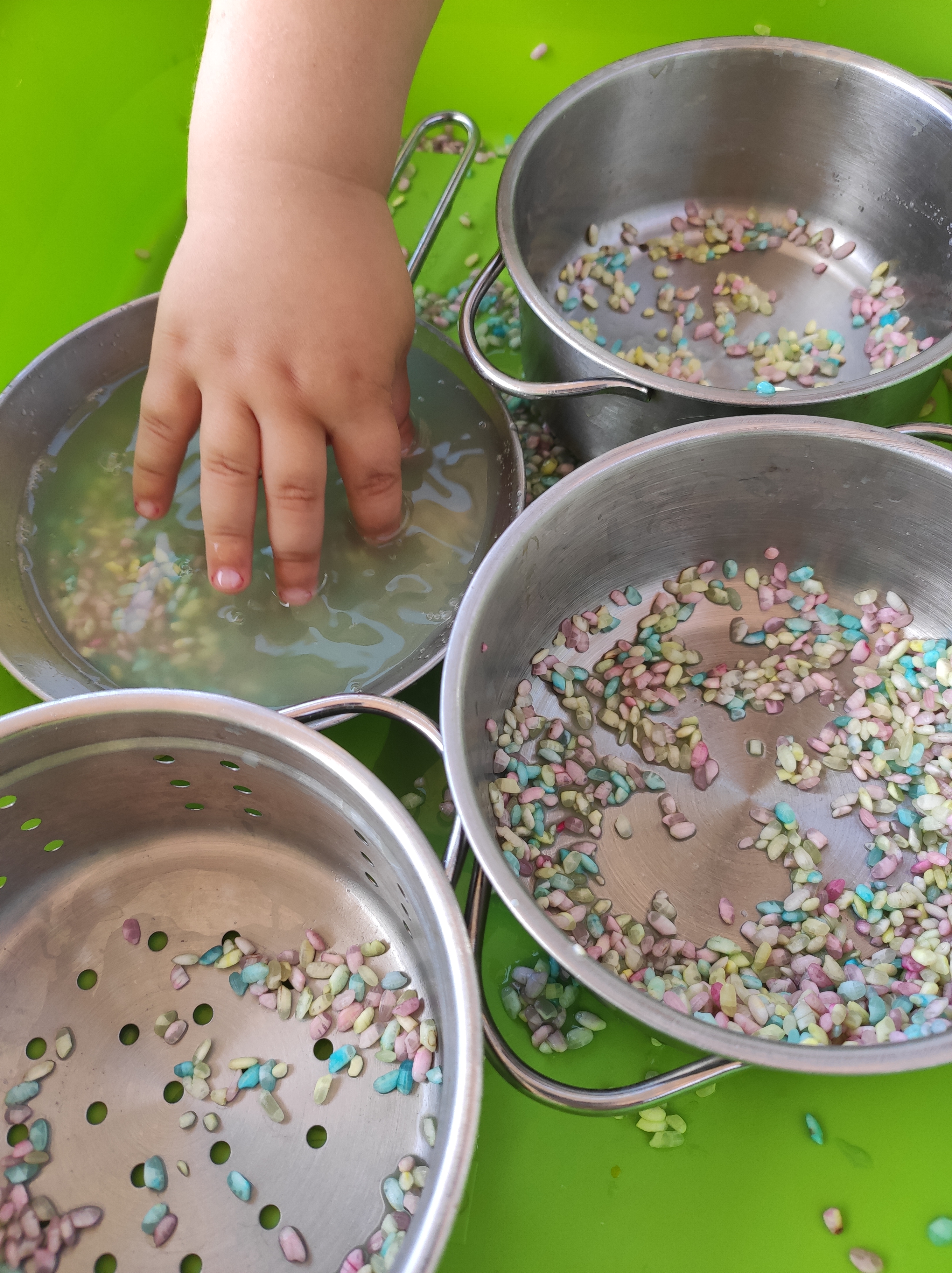 L’Arcadi no és gens de fan de l’arròs blanc, però avui l’hem fet servir per jugar i familiaritzar-nos una mica més amb ell, a veure si podem fer-li canviar la perspectiva del seu paladar…