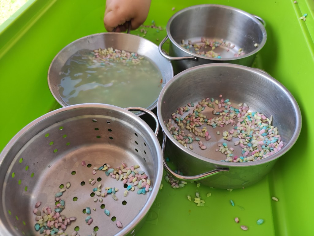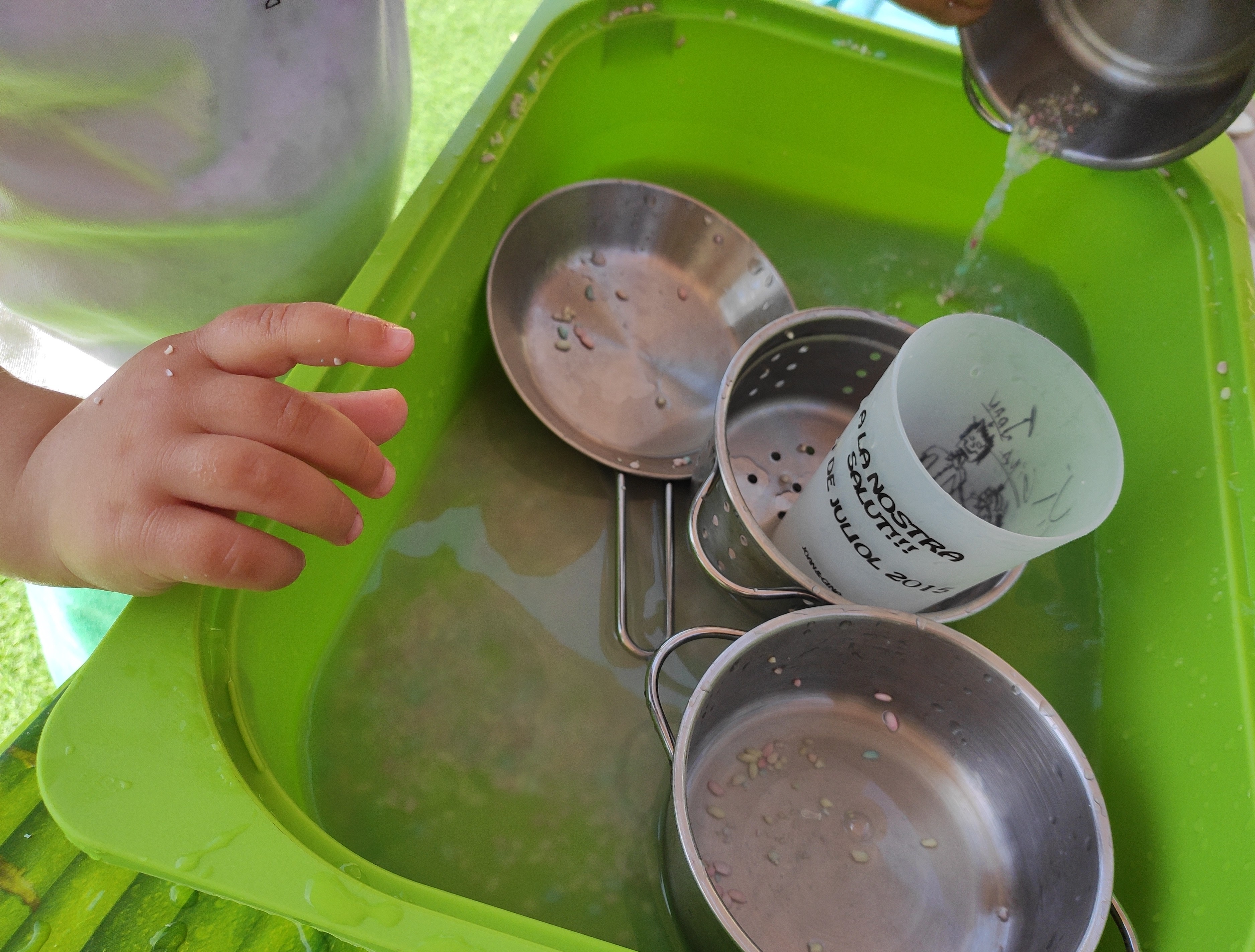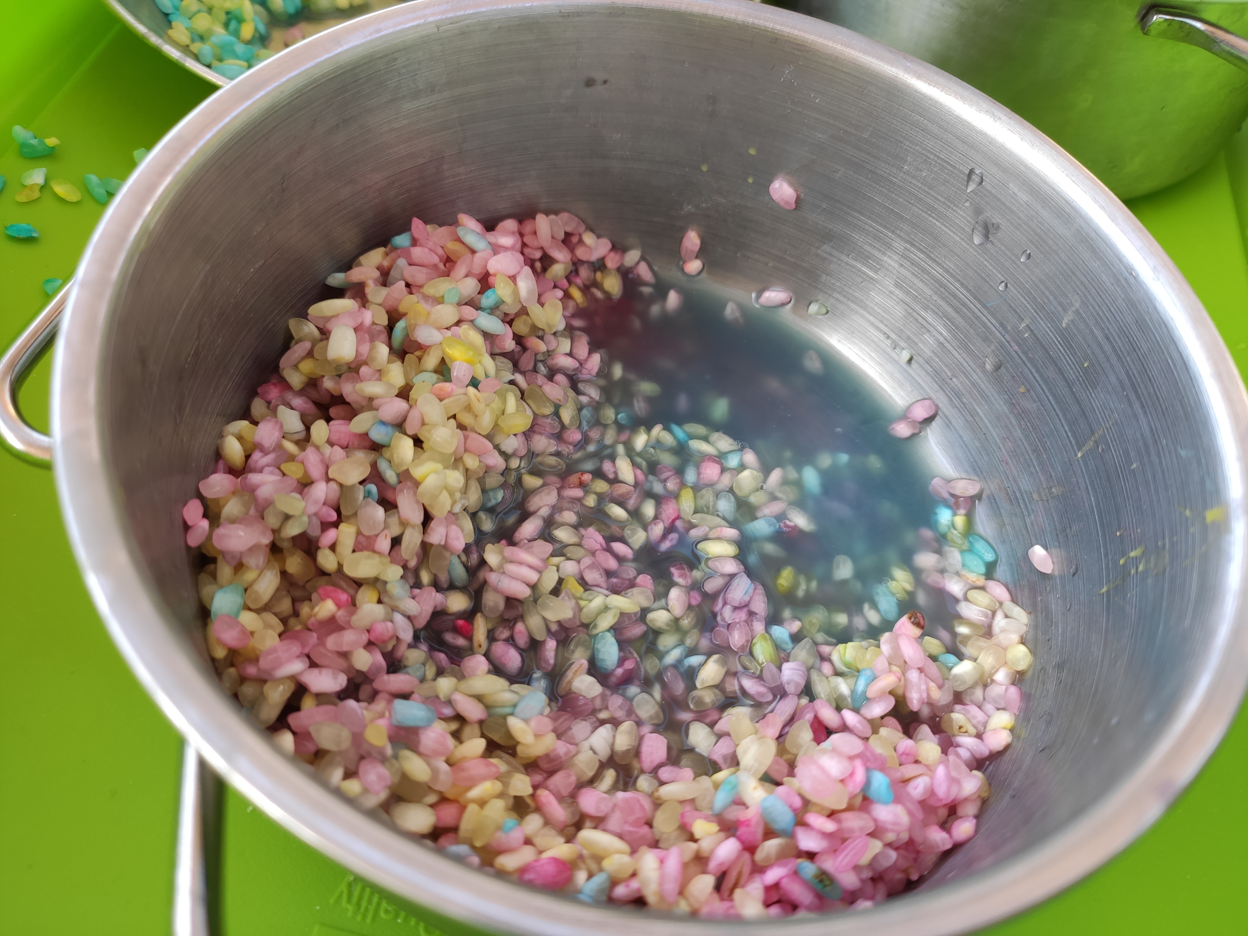 Primer hem posat els tres colors (blau, vermell i groc) per separat a l’arròs que hem distribuït en tres recipients. En segon lloc, quan l’Arcadi ha acabat de tenyir els arrossos, ha seguit barrejant aquests entre ells. D’aquesta forma, s’ha generat un espectacle visual molt xulo! Però l’activitat no ha acabat aquí, quan cuinem de veritat a l’arròs hi posem aigua, per tant, l’Arcadi també n’hi ha volgut afegir. Finalment, després de cuinar ha decidit rentar la muntanya de plats, així que ha tret l’arròs i s’ha posat a netejar tots els estris que ha utilitzat!