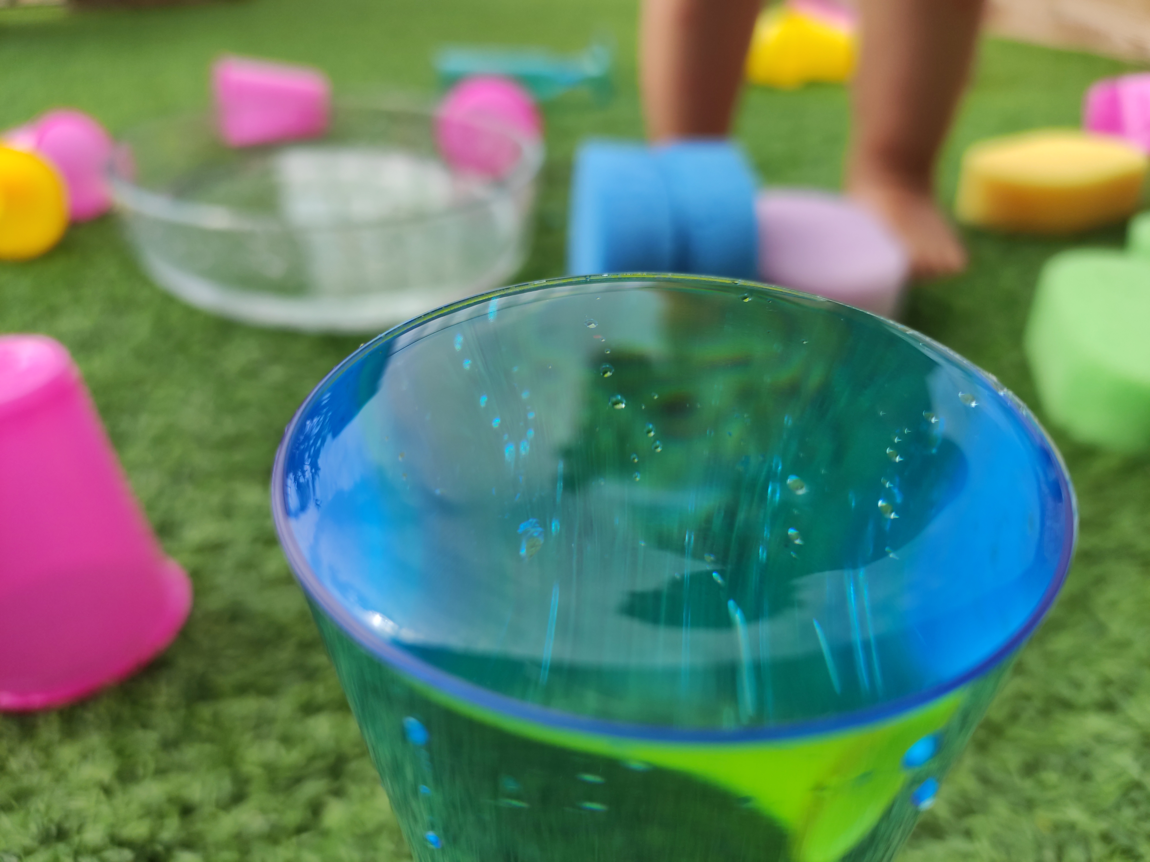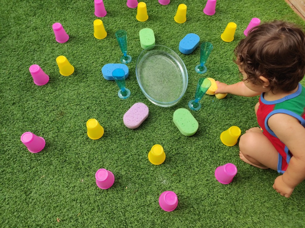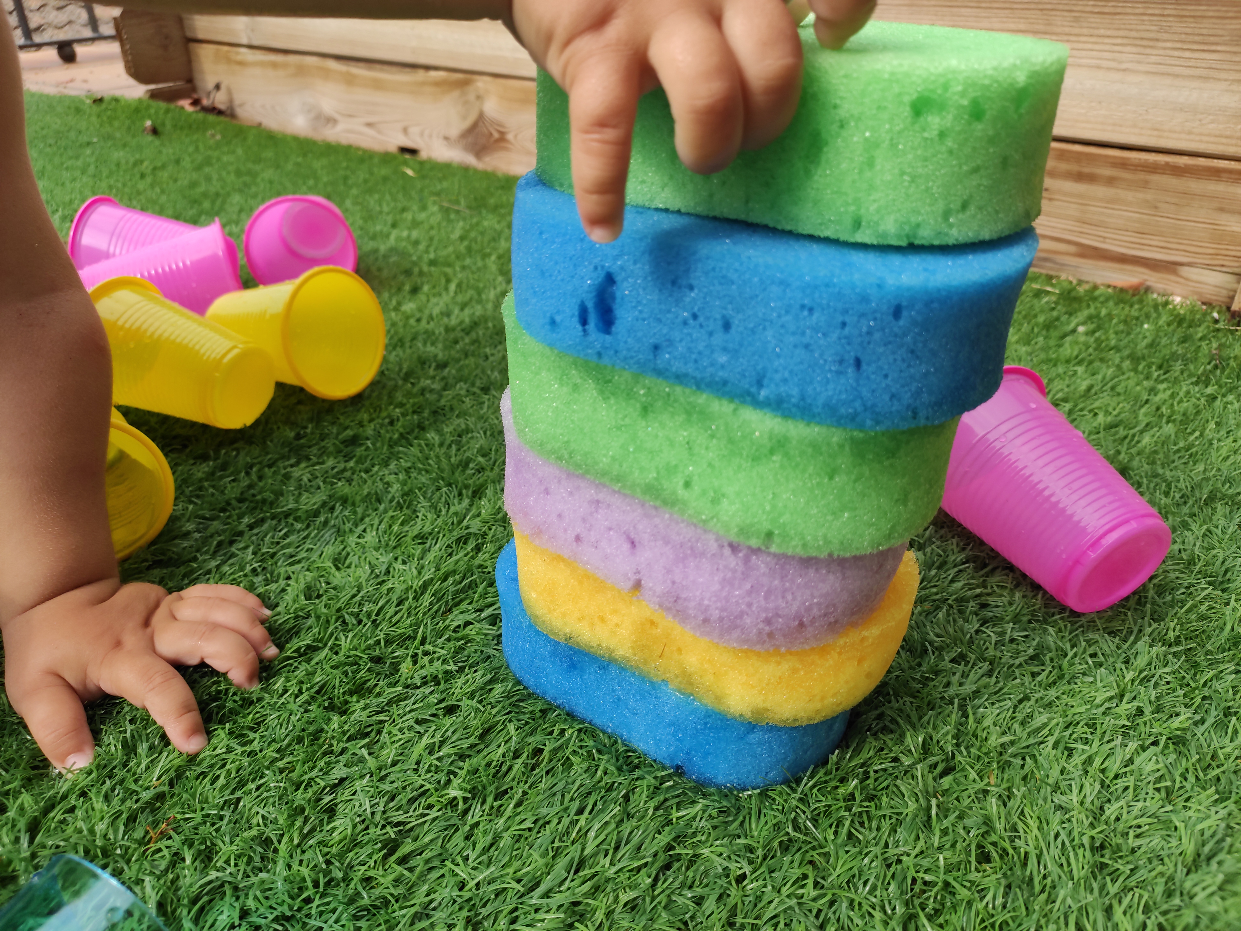 Les esponges són materials que tenim molt a l’abast. Ens permeten gaudir de textures, d’organitzacions en l’espai, de colors, de construccions, de contrastos de temperatures, etc. Avui hem creat una instal·lació on els esponges hi han sigut molt presents. Les hem acompanyat també d’altres materials com vasos i copes de plàstics per tal de poder jugar a fer transvasaments amb aigua. Tot i això, he de comentar-vos que el joc amb les esponges ha sigut el que més ha agradat a l’Arcadi, el qual s’ha passat força estona construint torres per tirar-les a terra amb la pressió de tot el seu cos i extreure així l’aigua absorbida.
