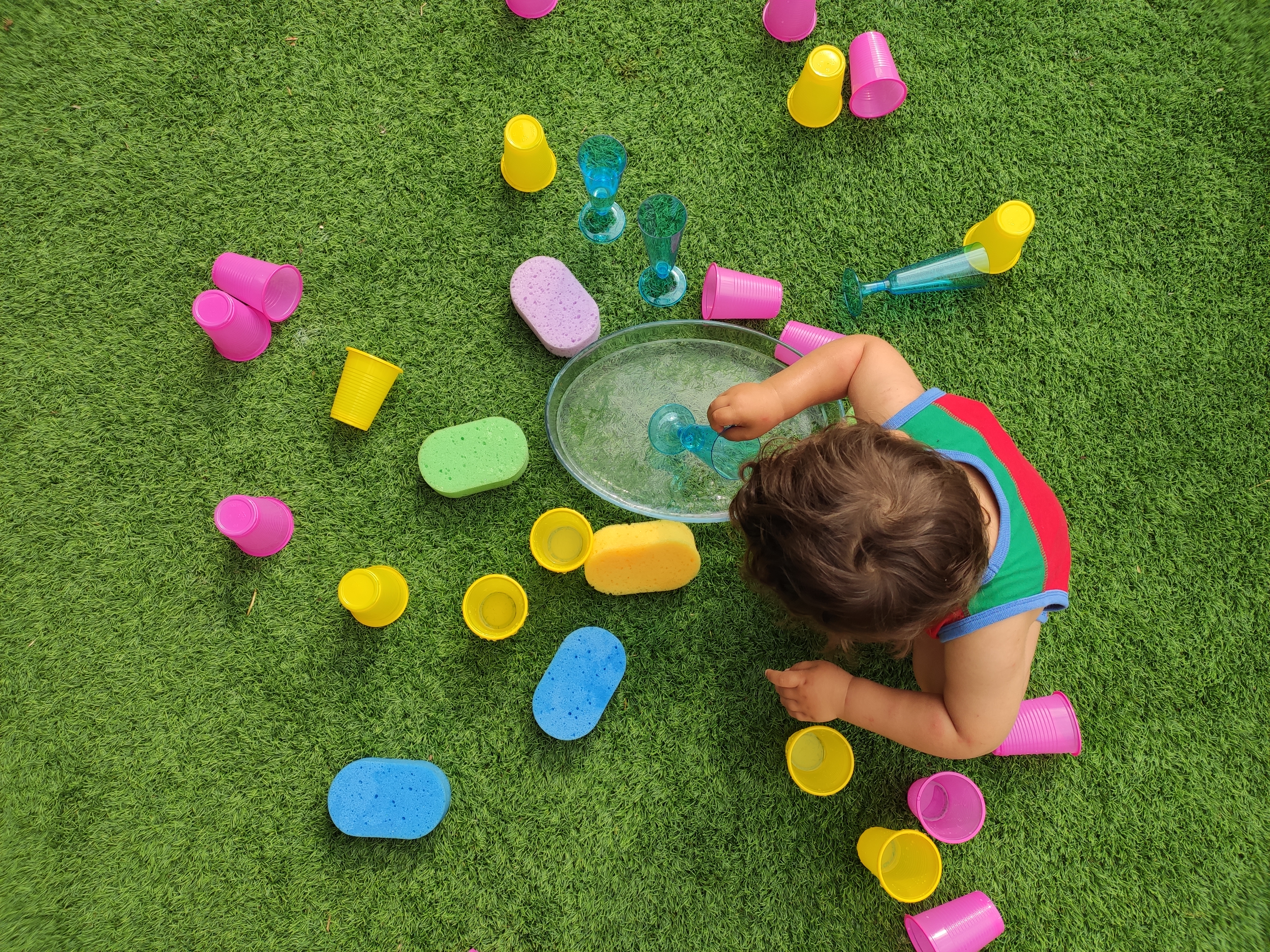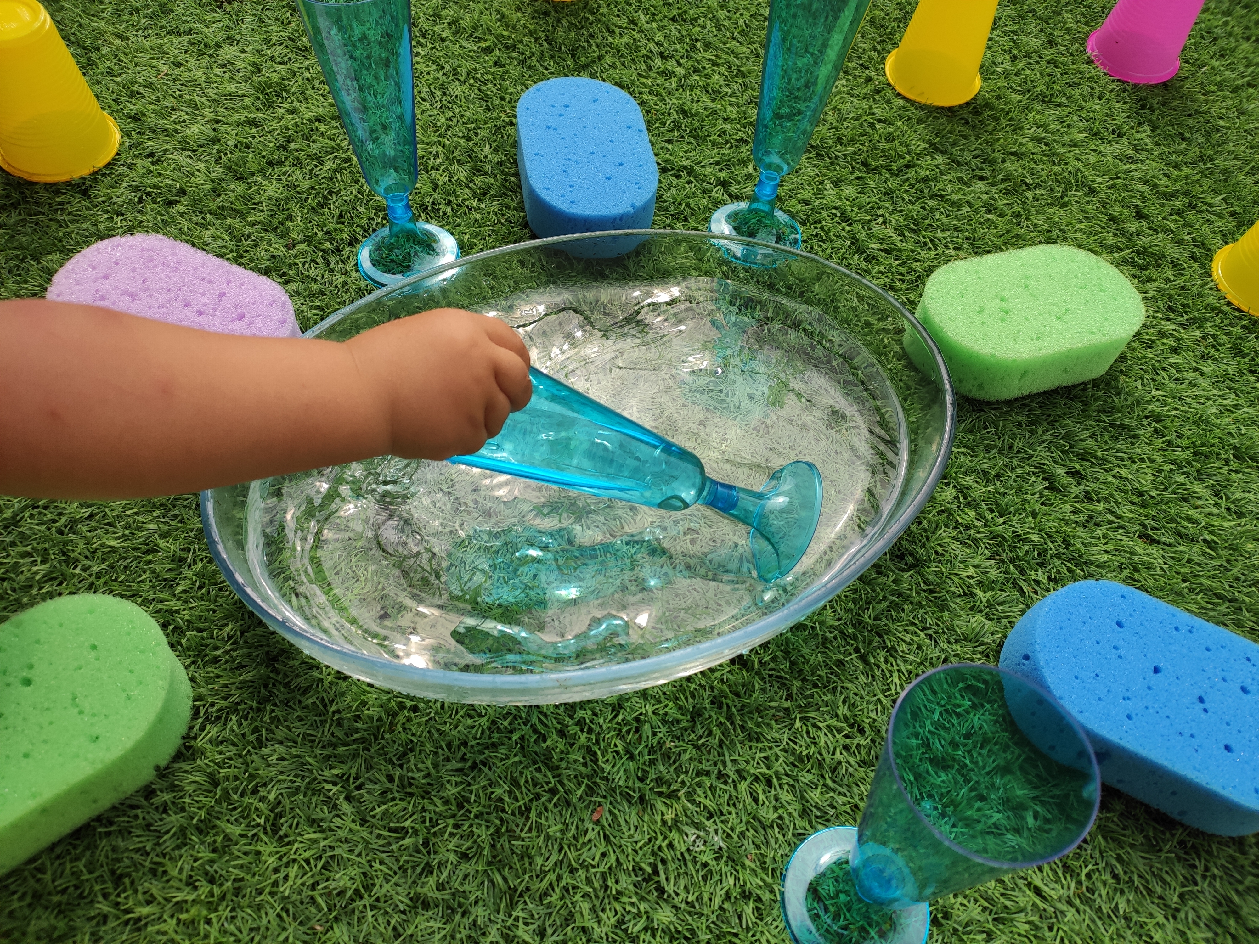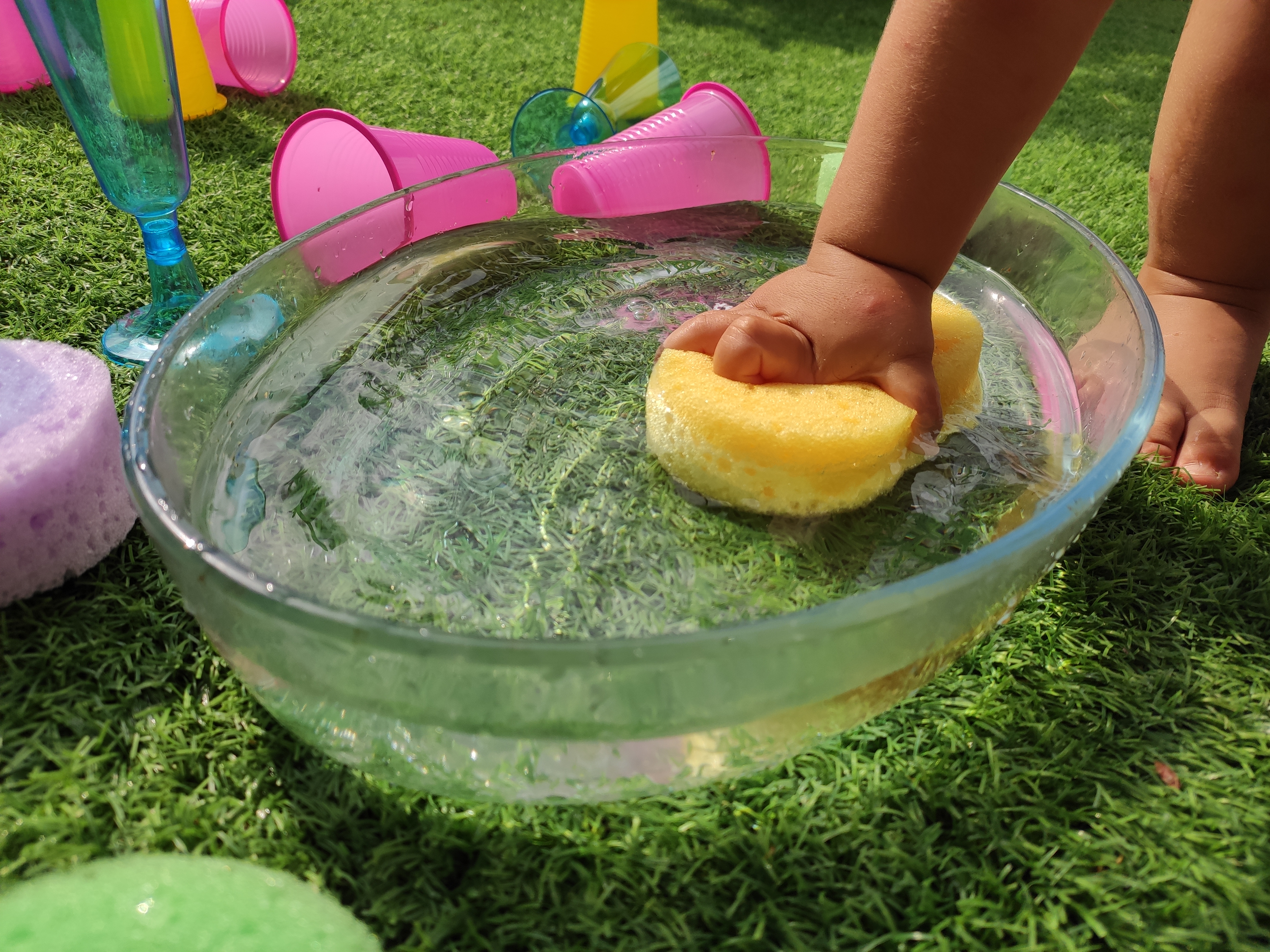 Les esponges són materials que tenim molt a l’abast. Ens permeten gaudir de textures, d’organitzacions en l’espai, de colors, de construccions, de contrastos de temperatures, etc. Avui hem creat una instal·lació on els esponges hi han sigut molt presents. Les hem acompanyat també d’altres materials com vasos i copes de plàstics per tal de poder jugar a fer transvasaments amb aigua. Tot i això, he de comentar-vos que el joc amb les esponges ha sigut el que més ha agradat a l’Arcadi, el qual s’ha passat força estona construint torres per tirar-les a terra amb la pressió de tot el seu cos i extreure així l’aigua absorbida.