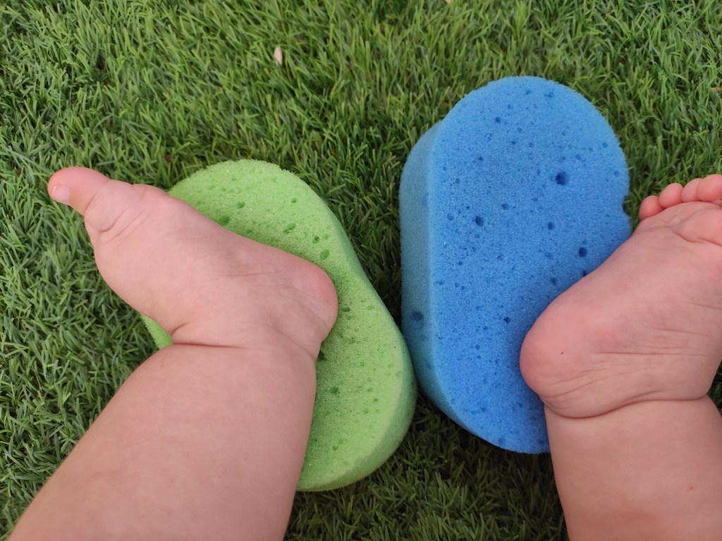 Sovint preparo els jocs per l’Arcadi, però poc a poc, també hi anem incorporant a l’Amadeu. En aquests tres mesos de vida sempre hi ha sigut present, però en segon pla, captant sorolls, imatges, sensorialitats de tot allò que anem creant… Avui l’hem incorporat en la proposta de forma més plena. L’hem motivat amb les esponges posant-lo panxa a terra i l’hem animat a que comenci a bellugar-se com un cuquet per agafar-les! També hem refrescat el seu cos, i, en especial, els seus peuets, tot jugant amb les textures de les esponges i la temperatura de l’aigua…