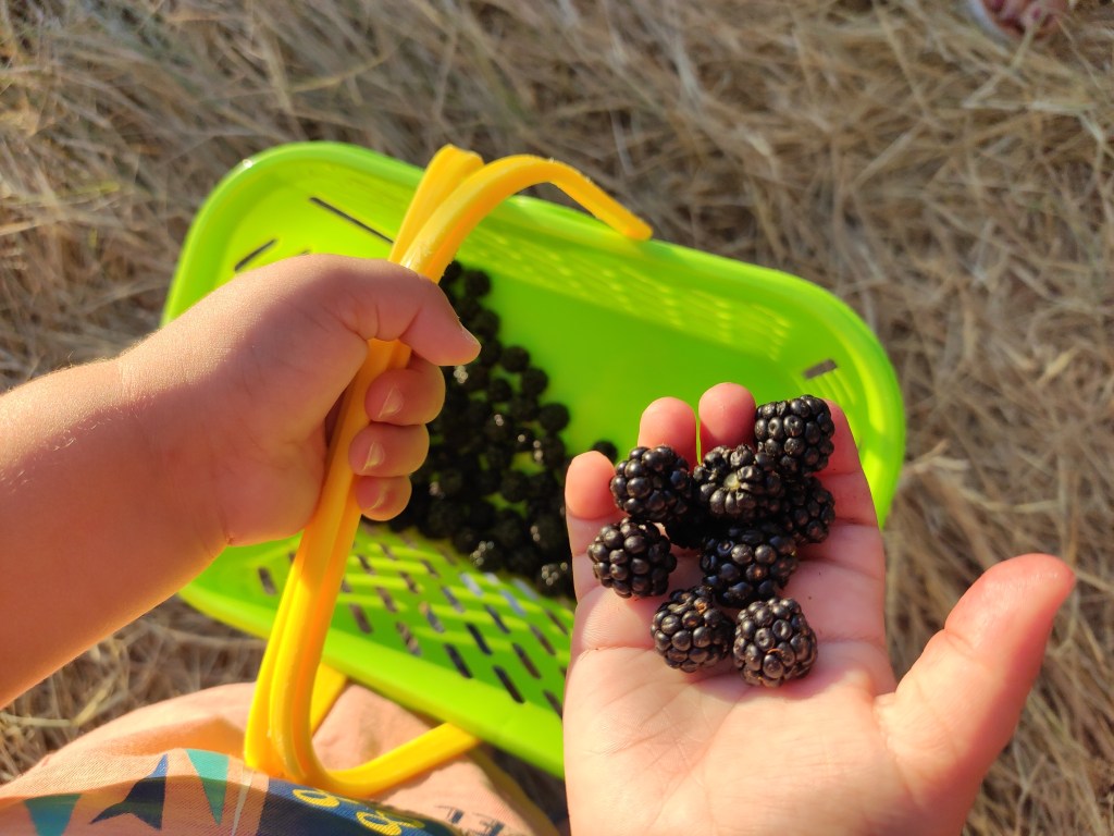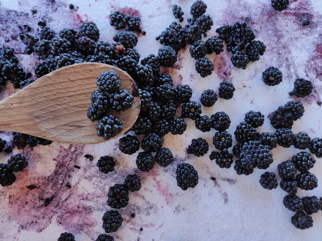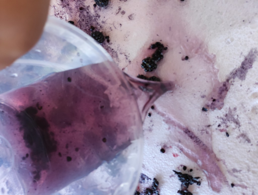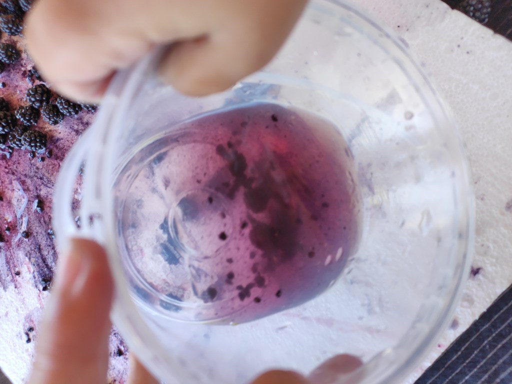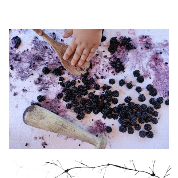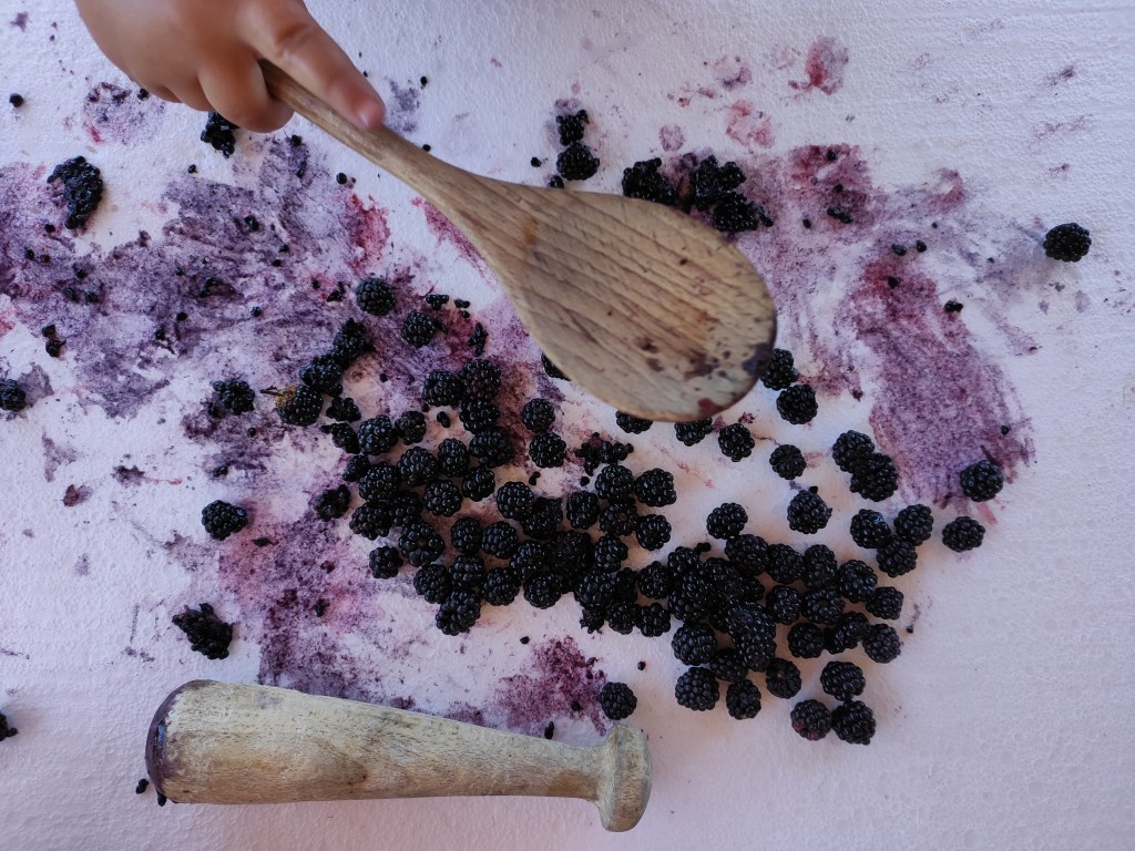 Després d’anar a collir les mores pels nostres camins de la masia, les hem rentat i ens hem disposat a exprimir-les amb diferents materials. Primer ho hem fet només amb les mans, notant així les textures, sentint com s’anaven separant els granets, gaudint de l’olor i del gust del suc que anava tintant la pell… I després hi hem incorporat altres eines com una cullera de fusta i una mà de morter per tal de poder triturar-les millor. És fascinant observar com van apareixen diferents tonalitats de roses i liles a mesura que aquestes van anant deixant el suc! Si ho feu sobre un fons blanc encara es poden apreciar millor tots aquests colors. Com de costum, a més, l’Arcadi ha volgut afegir aigua a les mores i encara ha sigut més bonic perquè el suc lilós s’ha escampat i s’ha fet encara més visible. Finalment, les mores han acabat dins d’un pot amb aigua per fer-ne sopa morada boníssima!
