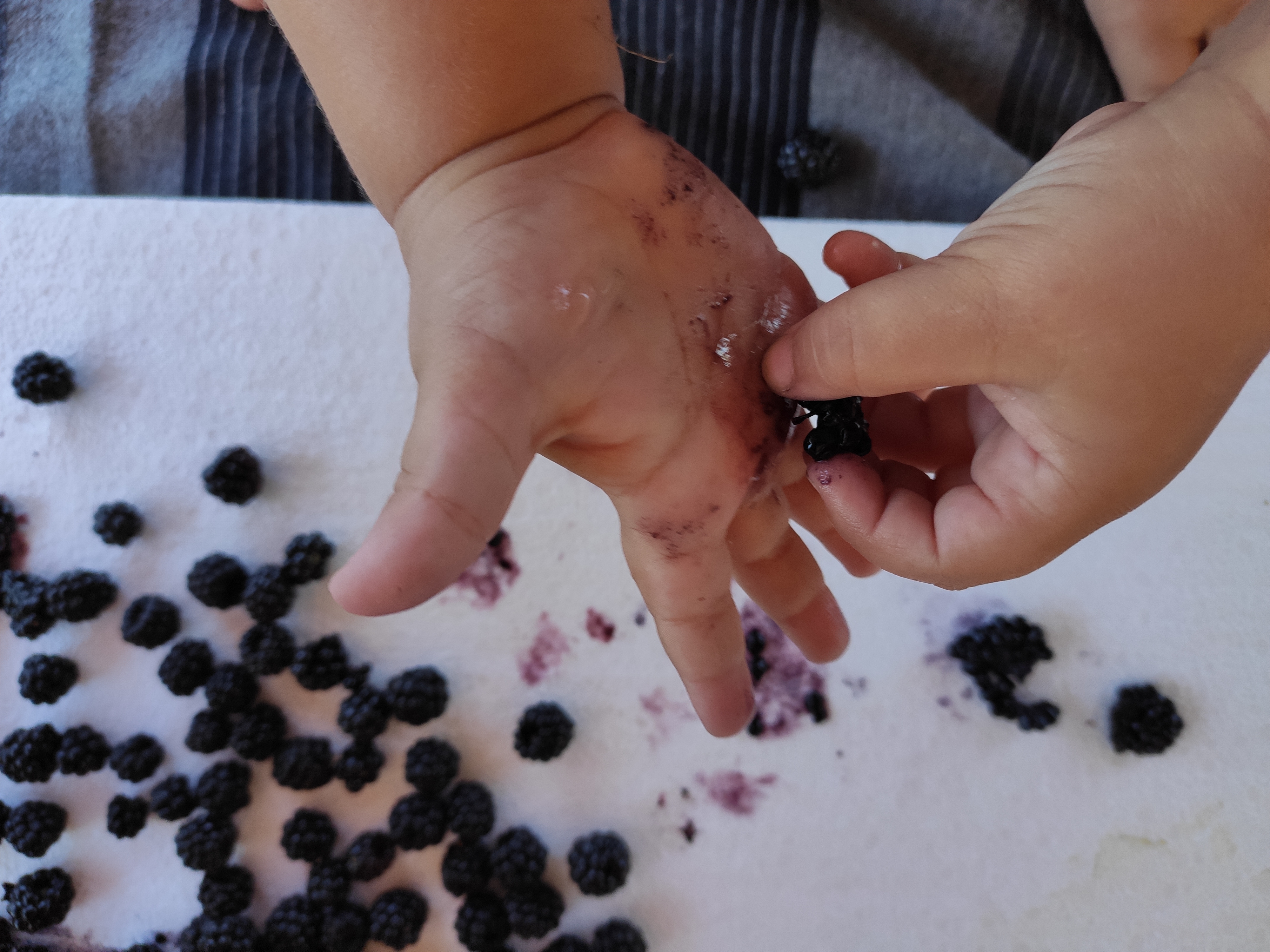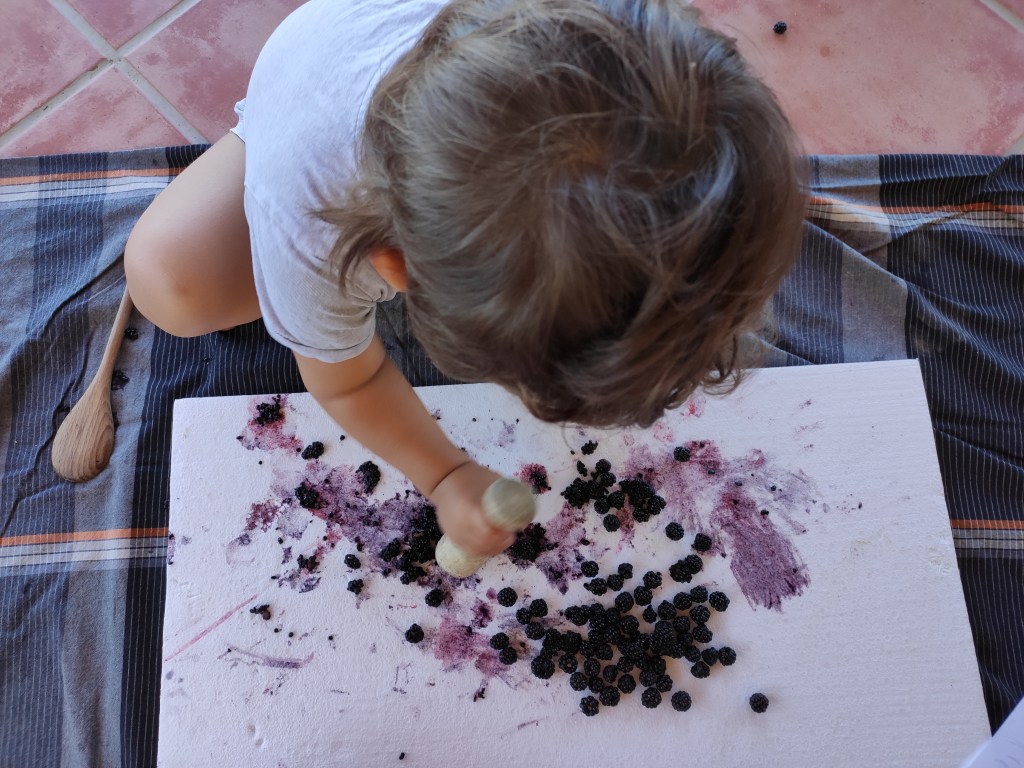 Tenir una mora entre els dits i no poder exprimir-la entre aquests és gairebé impossible quan aquesta cau en mans d’un infant. També podria anar directament a la boca, però en el cas de l’Arcadi, sempre manté distància a primera vista amb allò que li és desconegut… Com que pel gust les mores no l’han enamorat (gairebé un pecat!) hem optat per fer-ho a través de les mans i de la vista mitjançant la proposta d’avui. Segurament ho haureu provat alguna vegada, sinó, us animo a fer-ho perquè l’espectacle visual està assegurat!