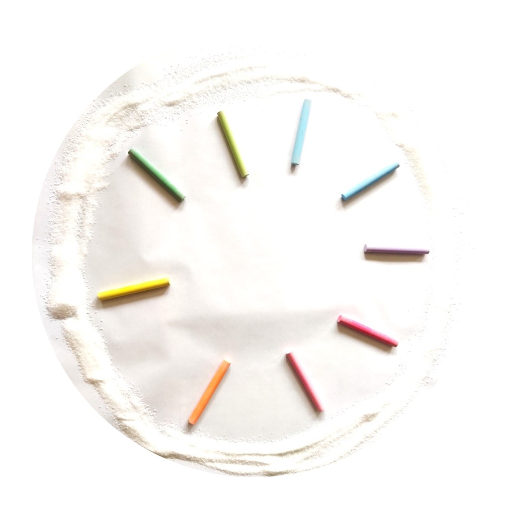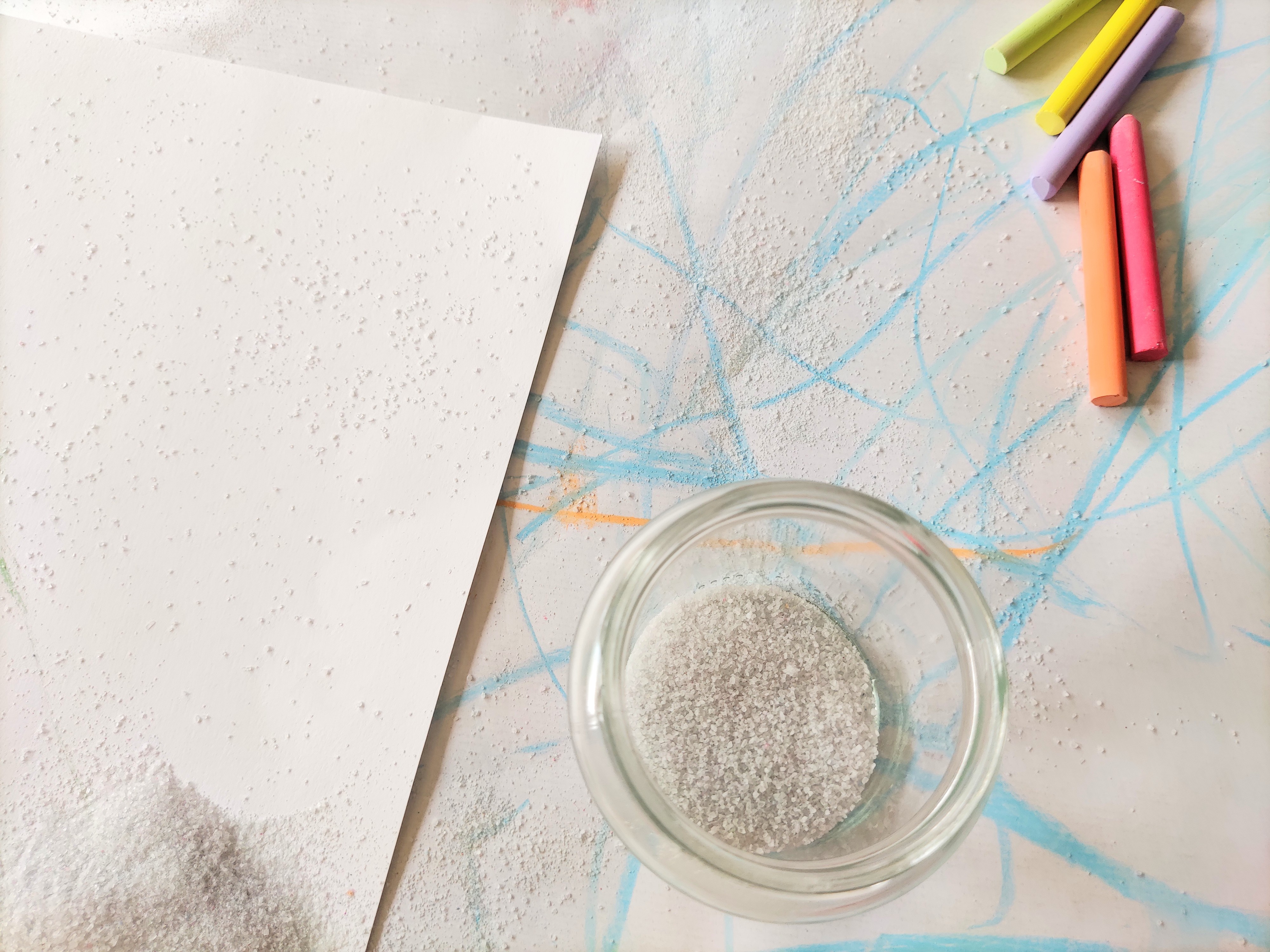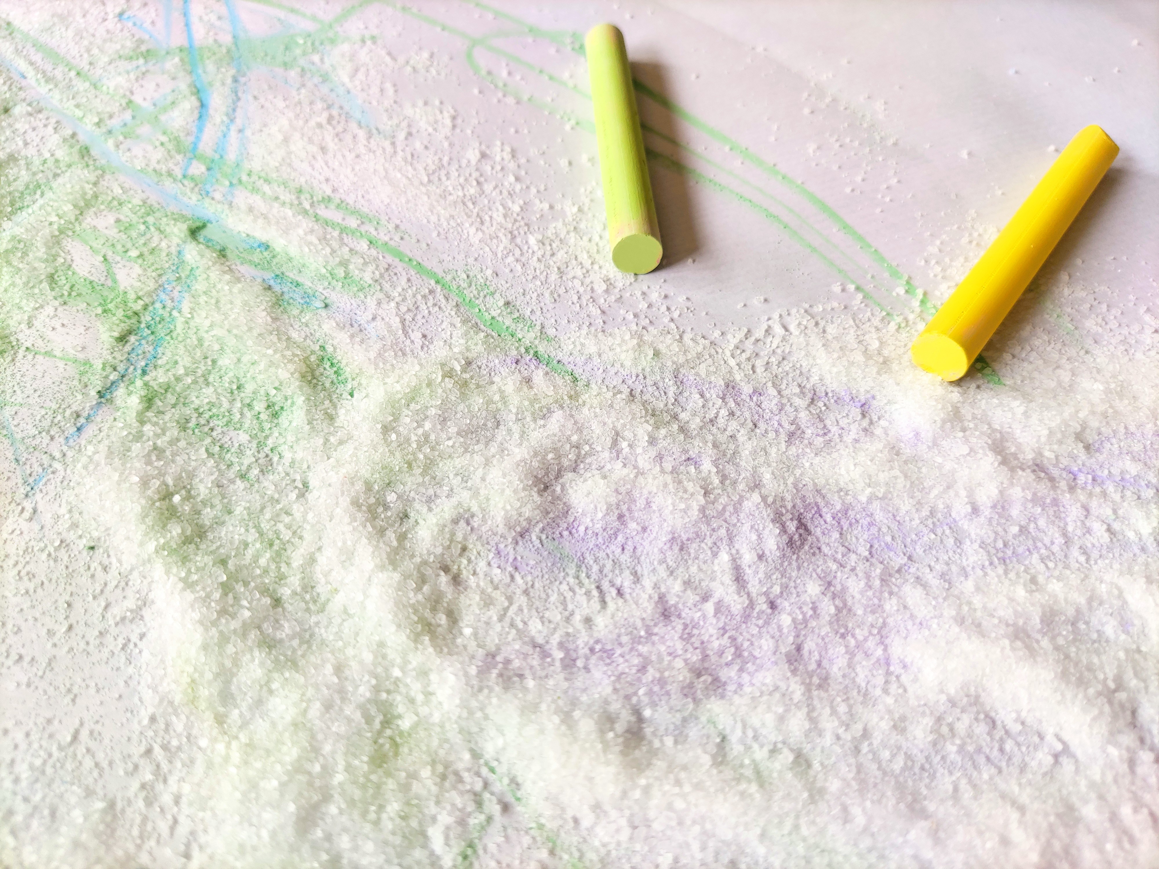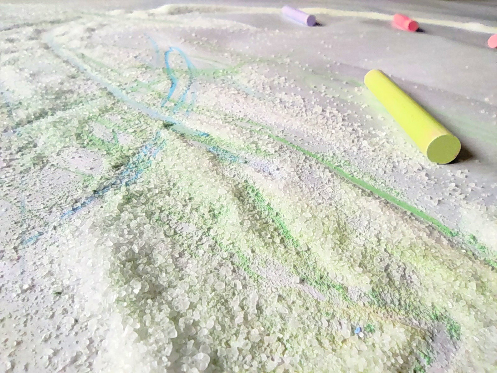 Segurament que al llarg de les vostres vides heu pintat alguna vegada sal amb guixos de colors, una sal que sempre acaba entaforada per capes de colors en un potet de vidre, segellant-la de per vida. Avui hem pintat amb sal, però les possibilitats posteriors han sigut infinites, deixant pas a l’incertesa del moment: l’hem manipulat amb pinzells, culleres, fulls de paper, tractors, cotxes… convertint-la així en símbols diversos. L’hem transformat en neu i en pluja, ens hem fet massatges al cos… I finalment hi hem incorporat aigua per descobrir que aquesta s’acaba dissolent quan es remena amb aquest líquid, recordant així a l’aigua del mar. Hem vist com un joc tradicional ha deixat pas a un món de creació, simplement es tracta de deixar emergir aquestes possiblitats.