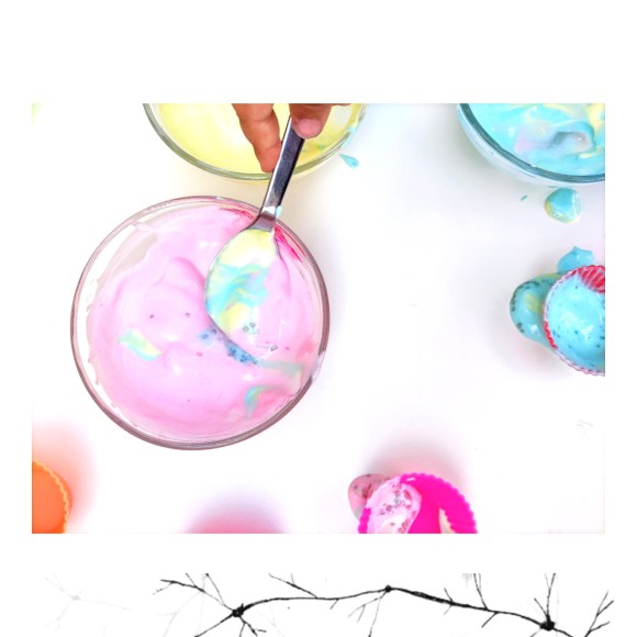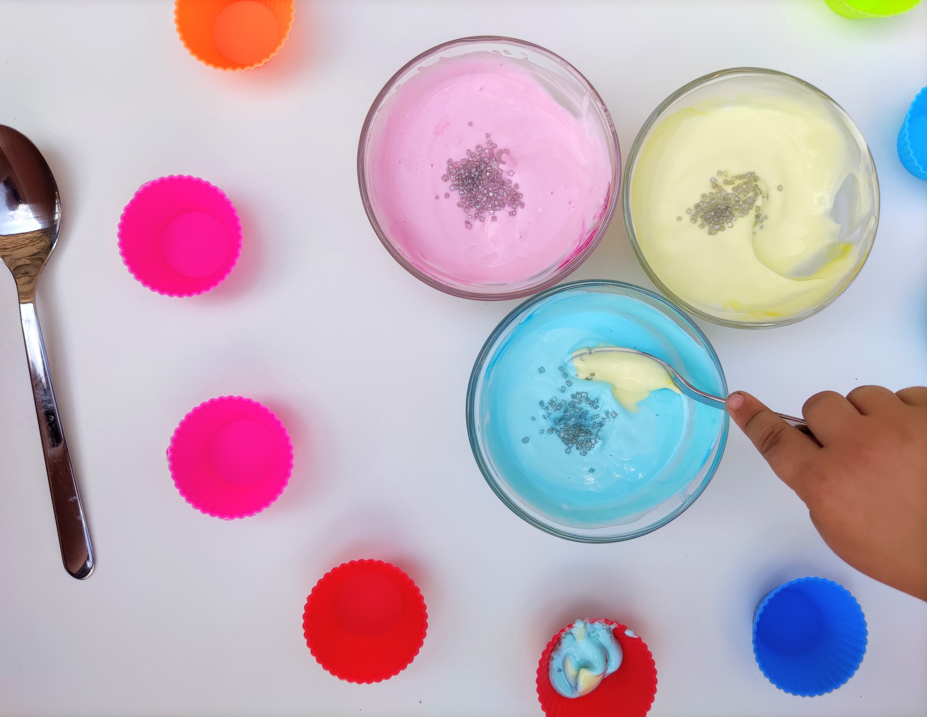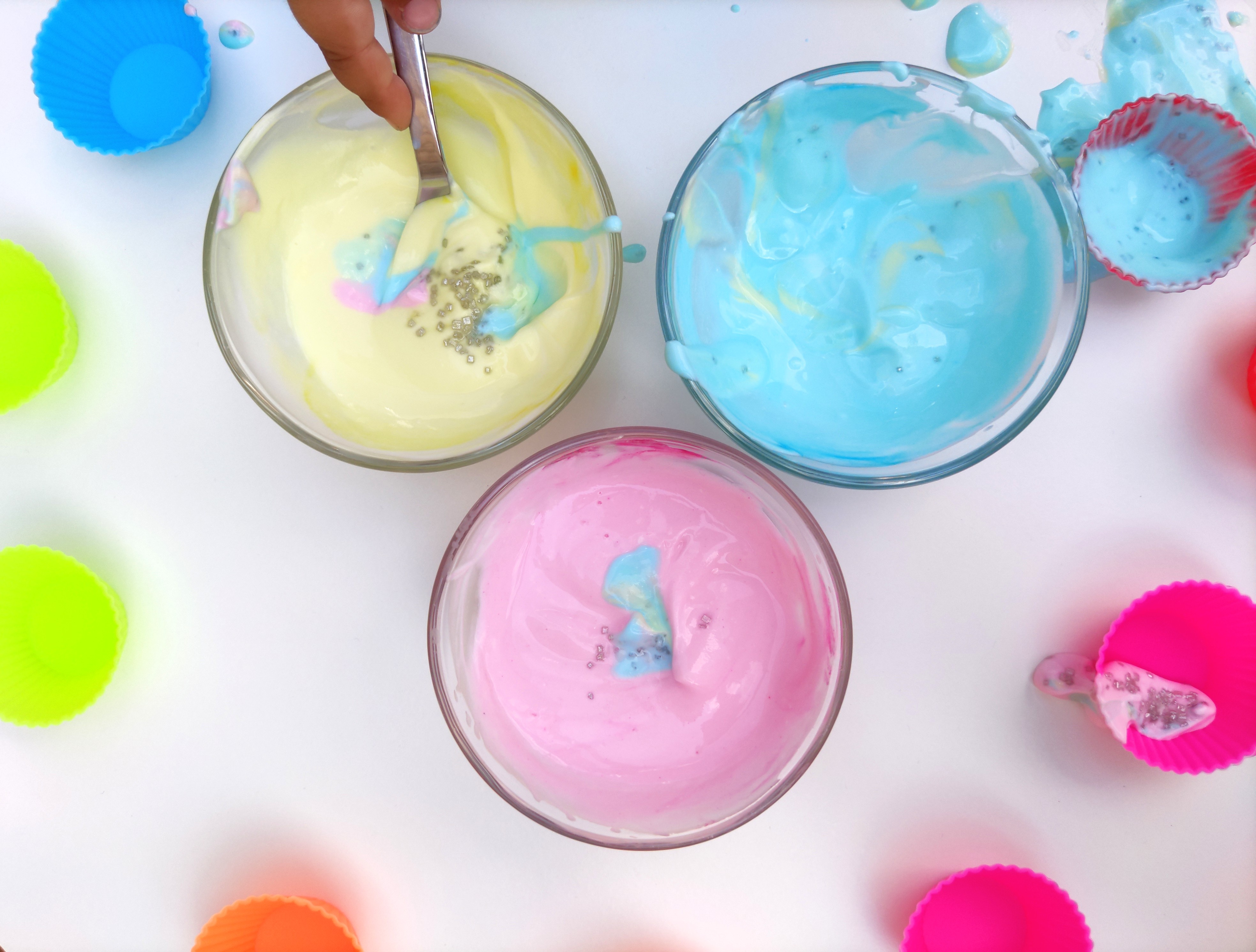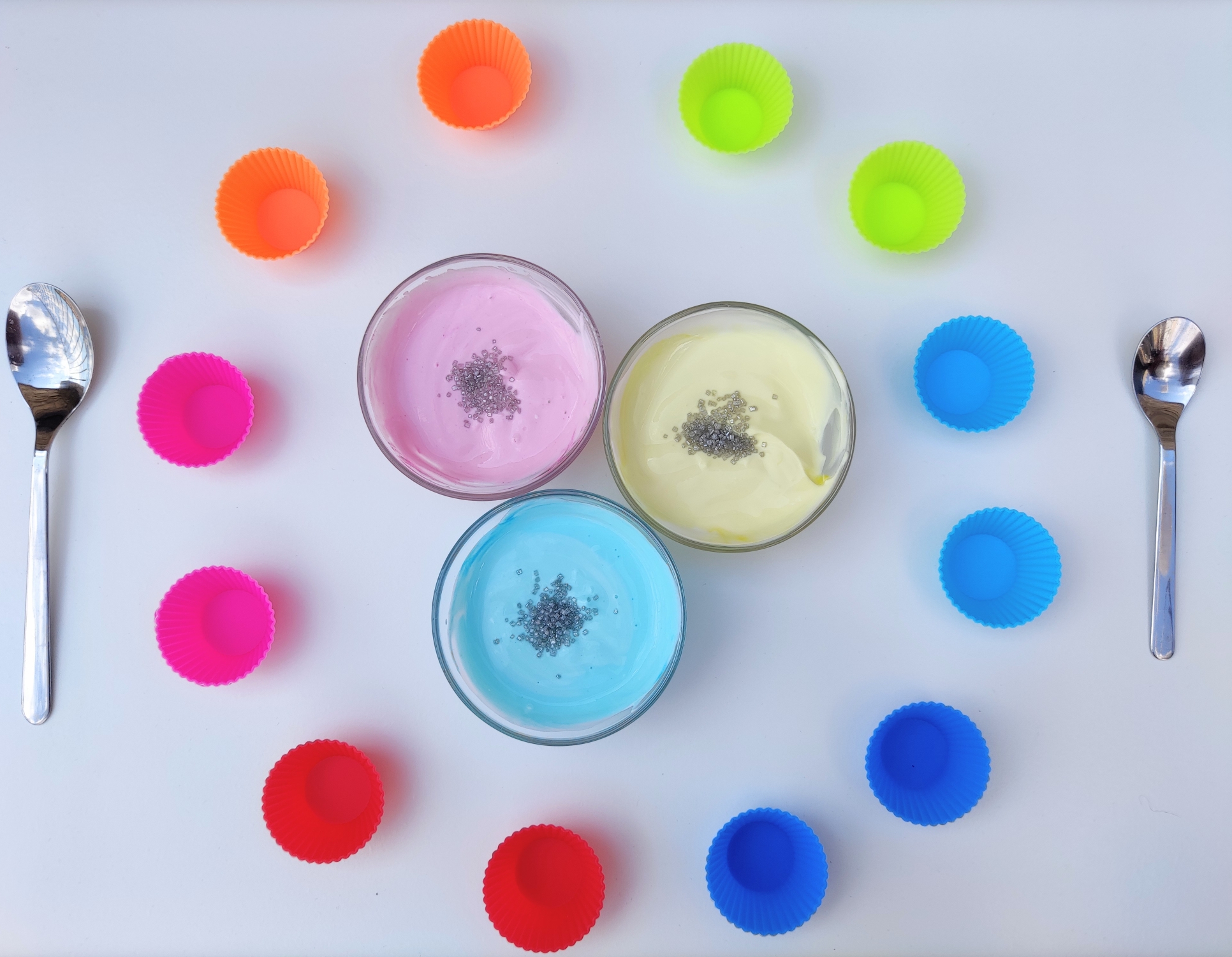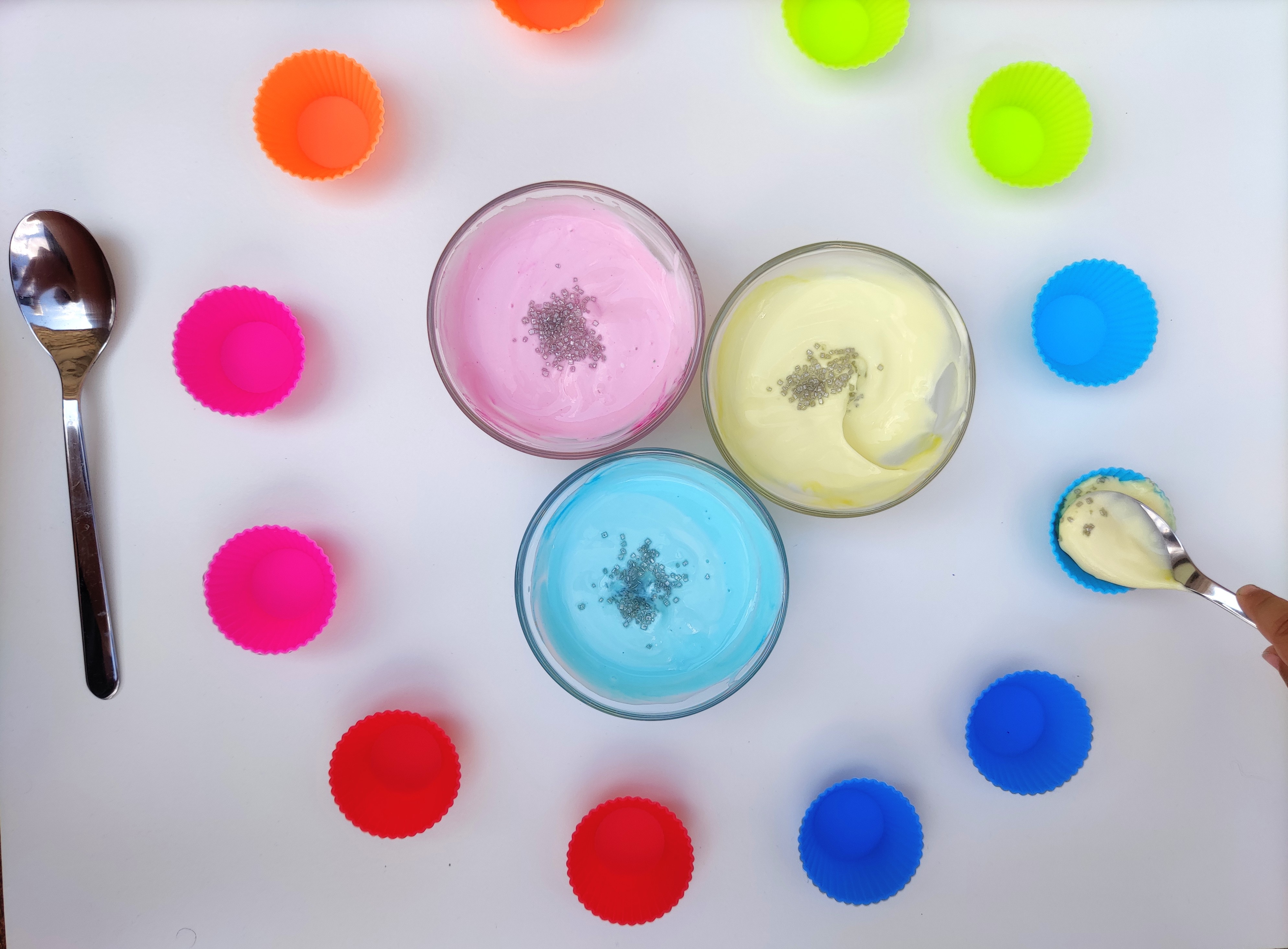 La proposta d’avui és plena de colors i de materials culinàris: iogurt, colorant, sucre, culleres i motlles de magdalenes petits de silicona.
