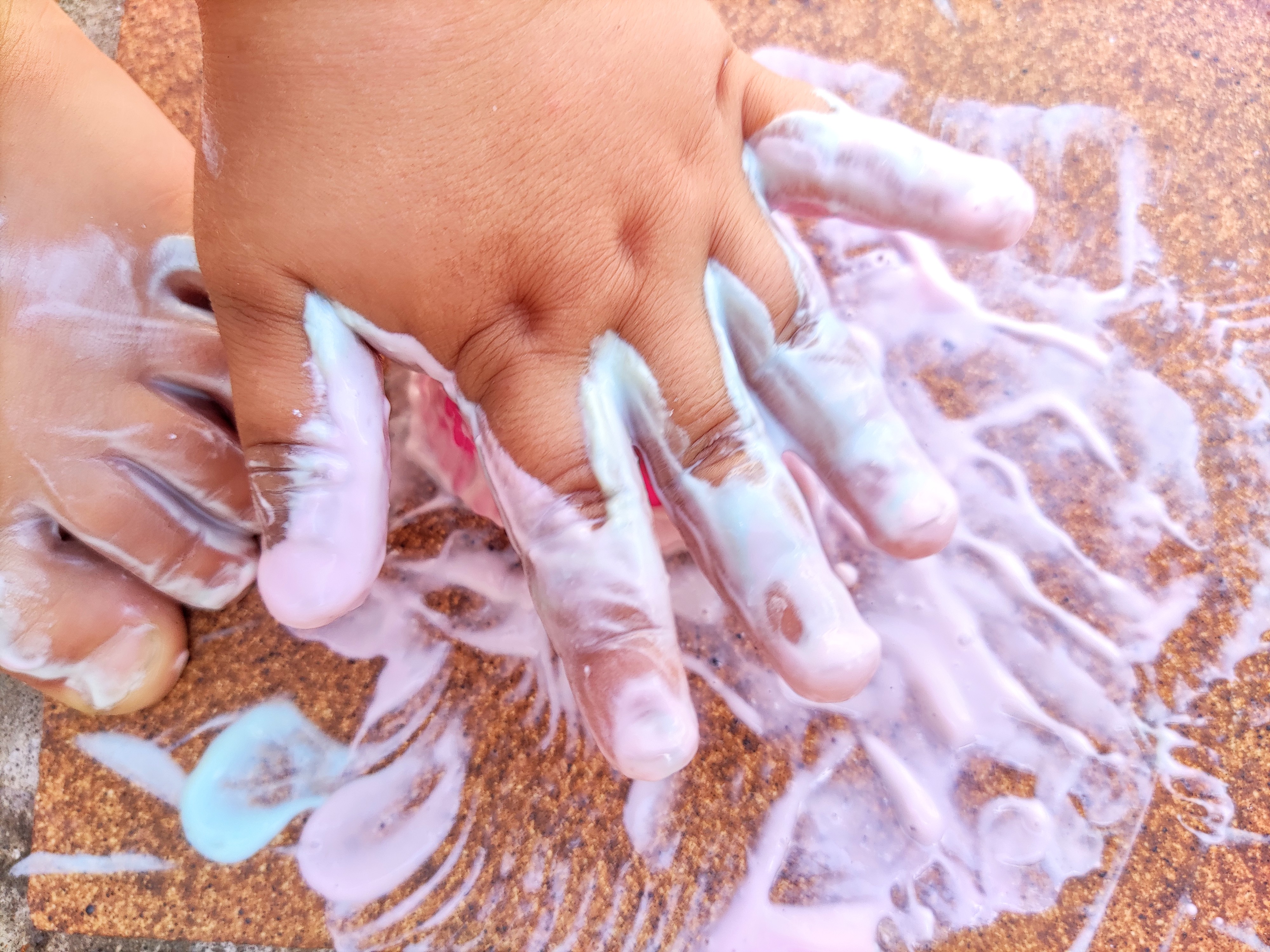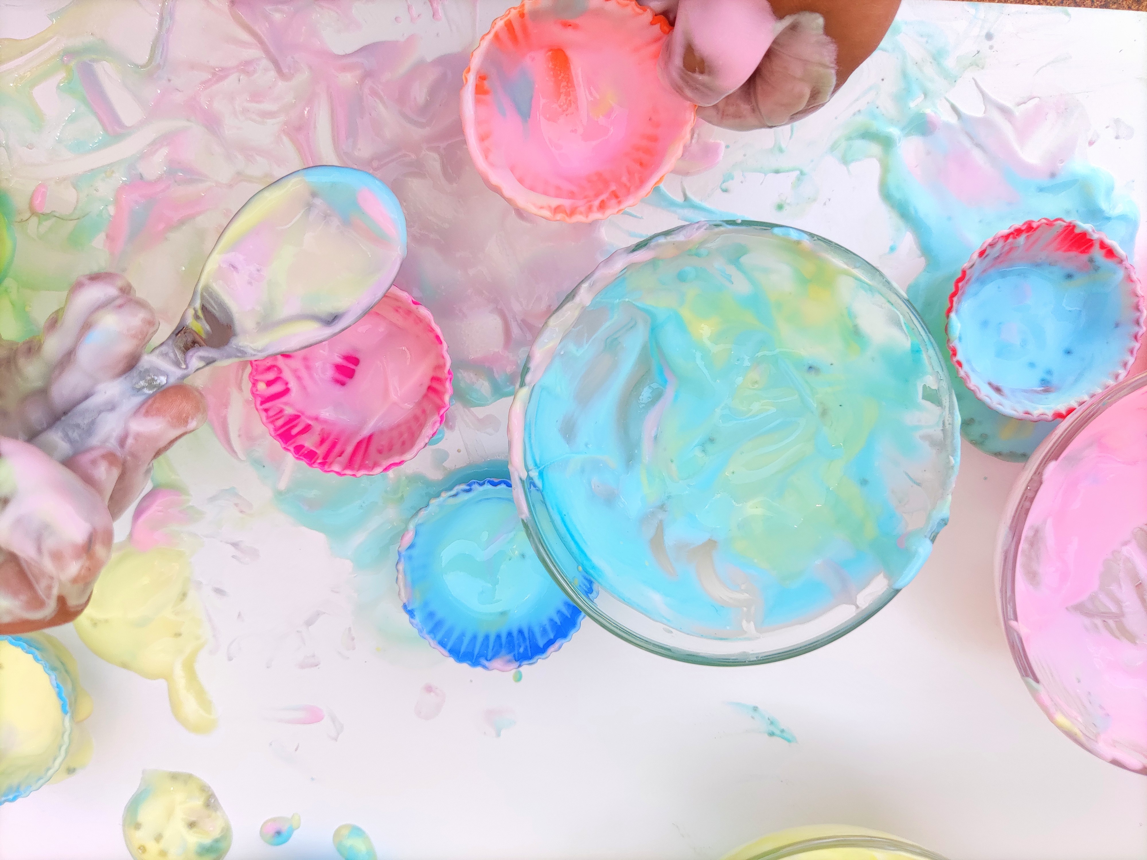 L’Arcadi ha començat de forma tímida a posar culleretes de cada color dins de les magdalenes. Primer no barrejava els colors, però, després, poc a poc, les culleres anaven deixant rastres de colors preciosos entre els bols i això ha convidat a experimentar amb la barreja! Finalment, hem acabat pintant el terra amb iogurt i també tot el nostre cos! La nostra pell ha fet un “peeling” làctic genial!