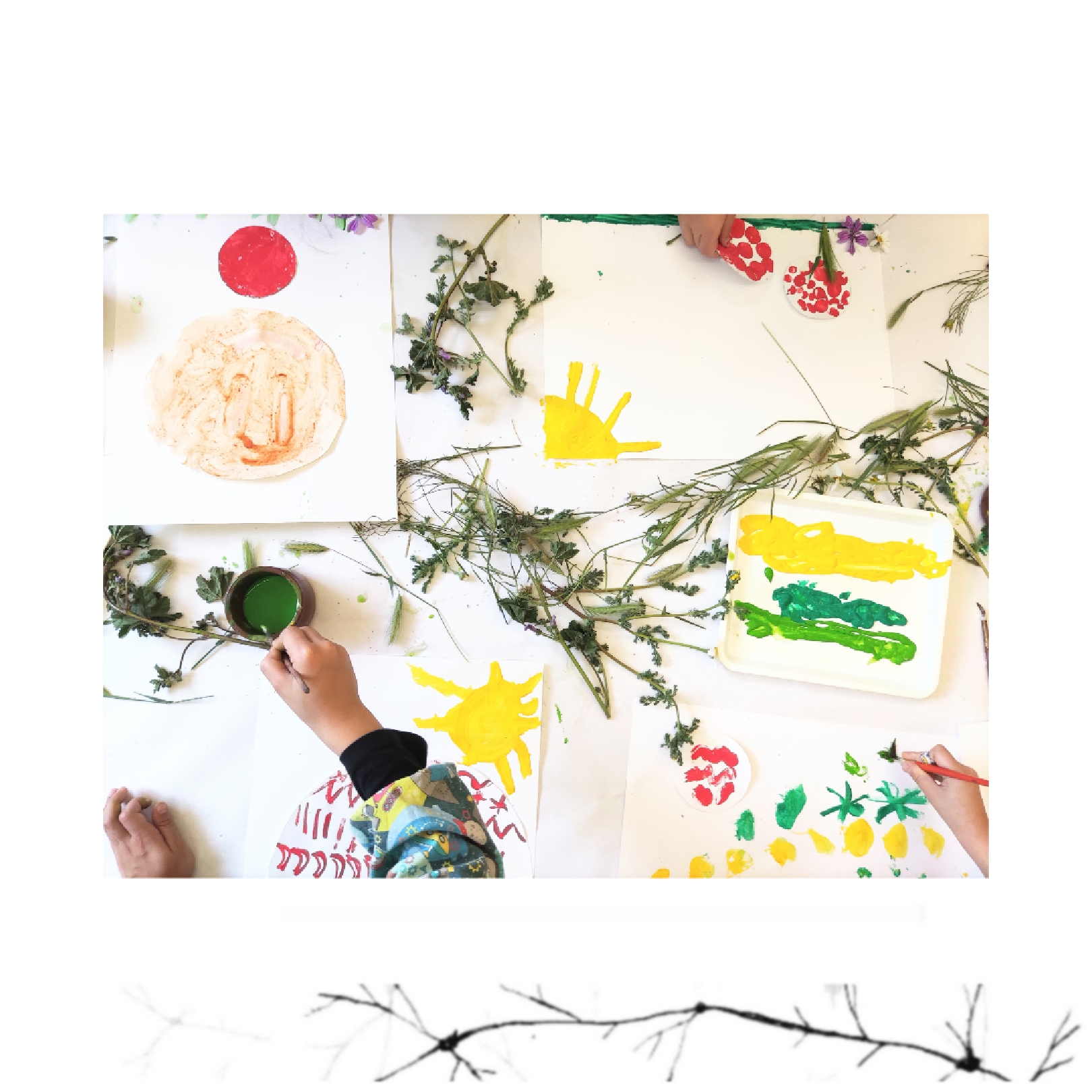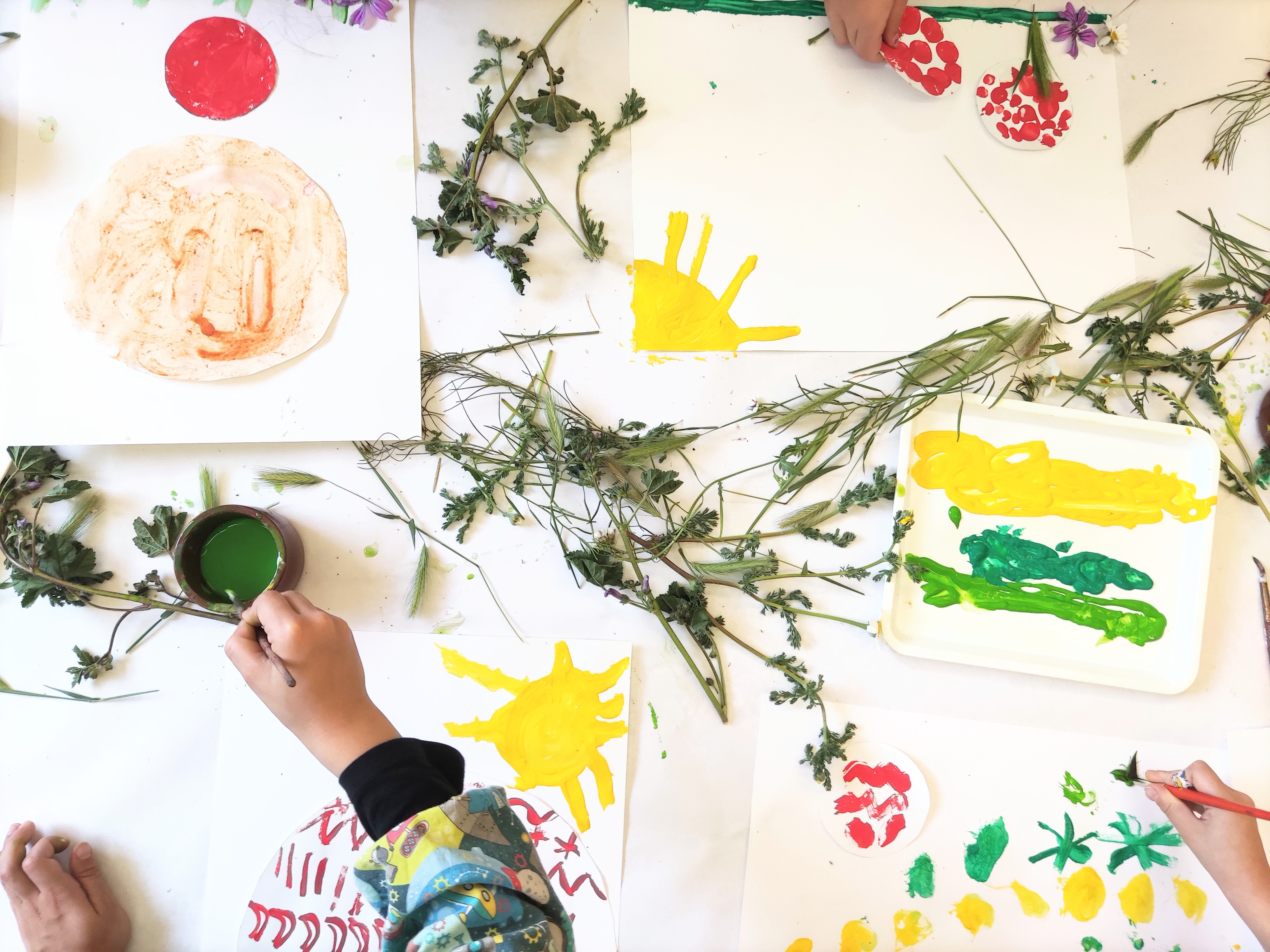 Creant paisatges primaverals sobre làmines artístiques, barrejant-los amb flors de l’entorn, pintura verda i groga.